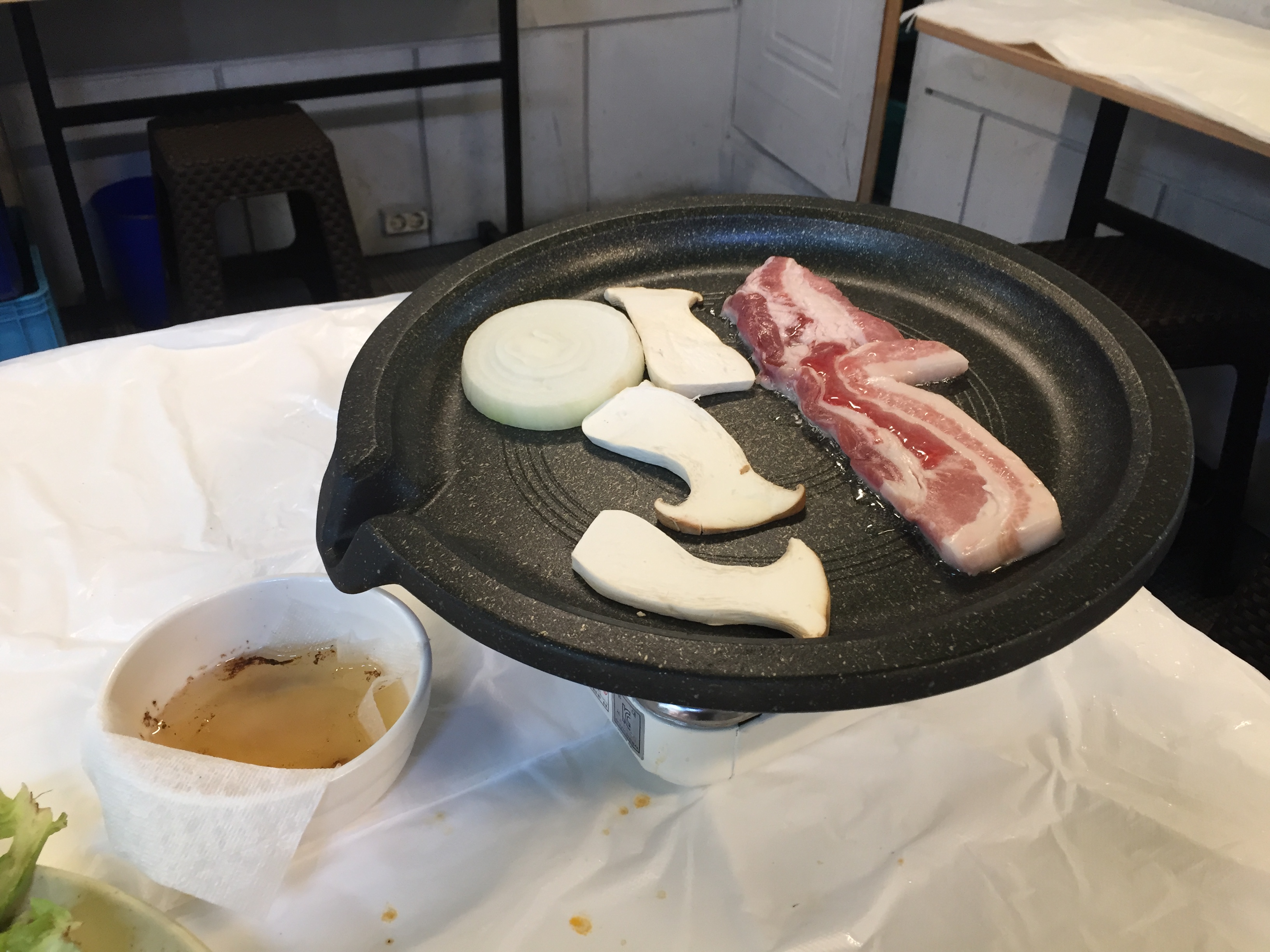 삼겹살에서 나온 기름에 콩나물 무침도 굽습니다.