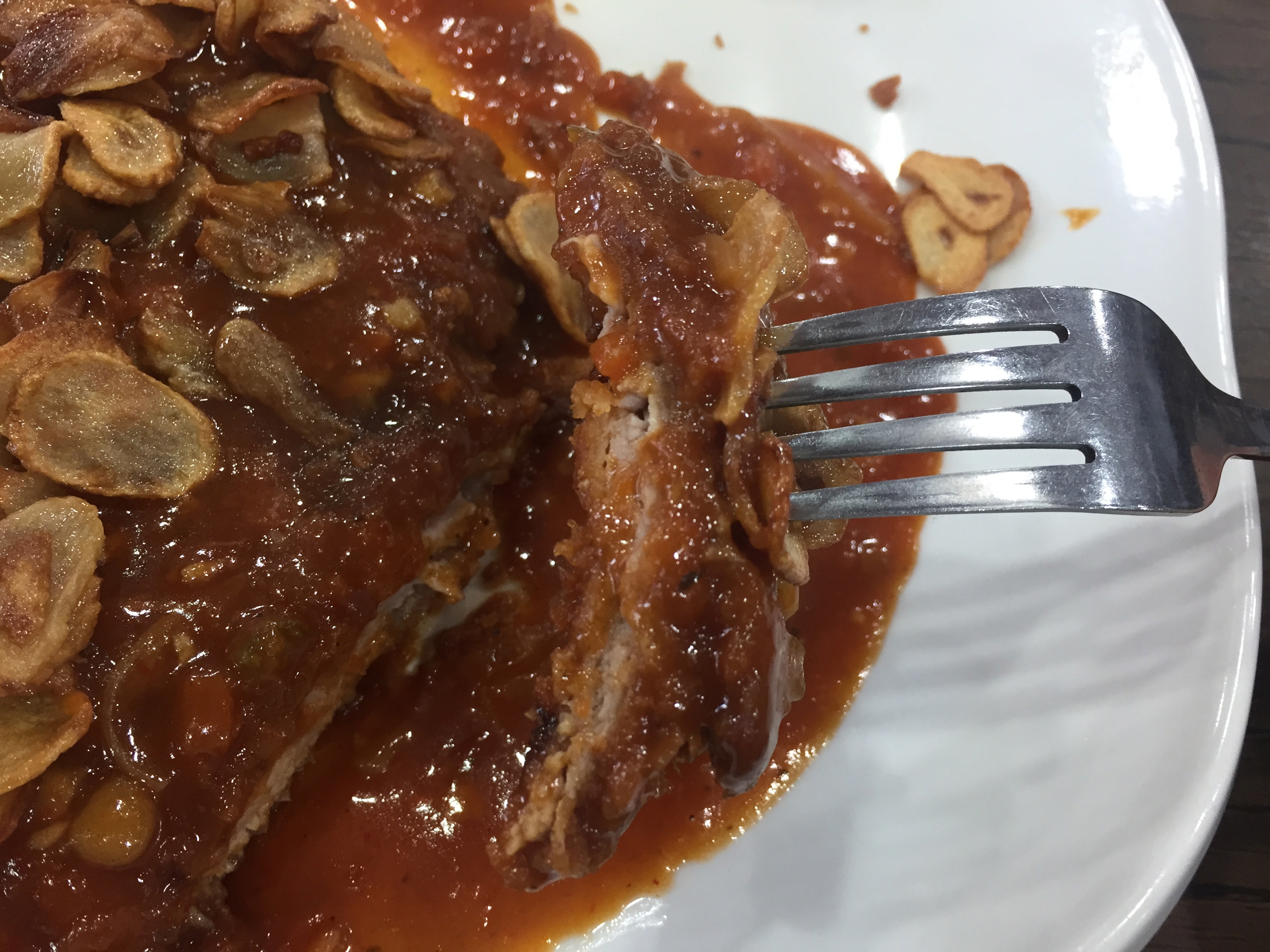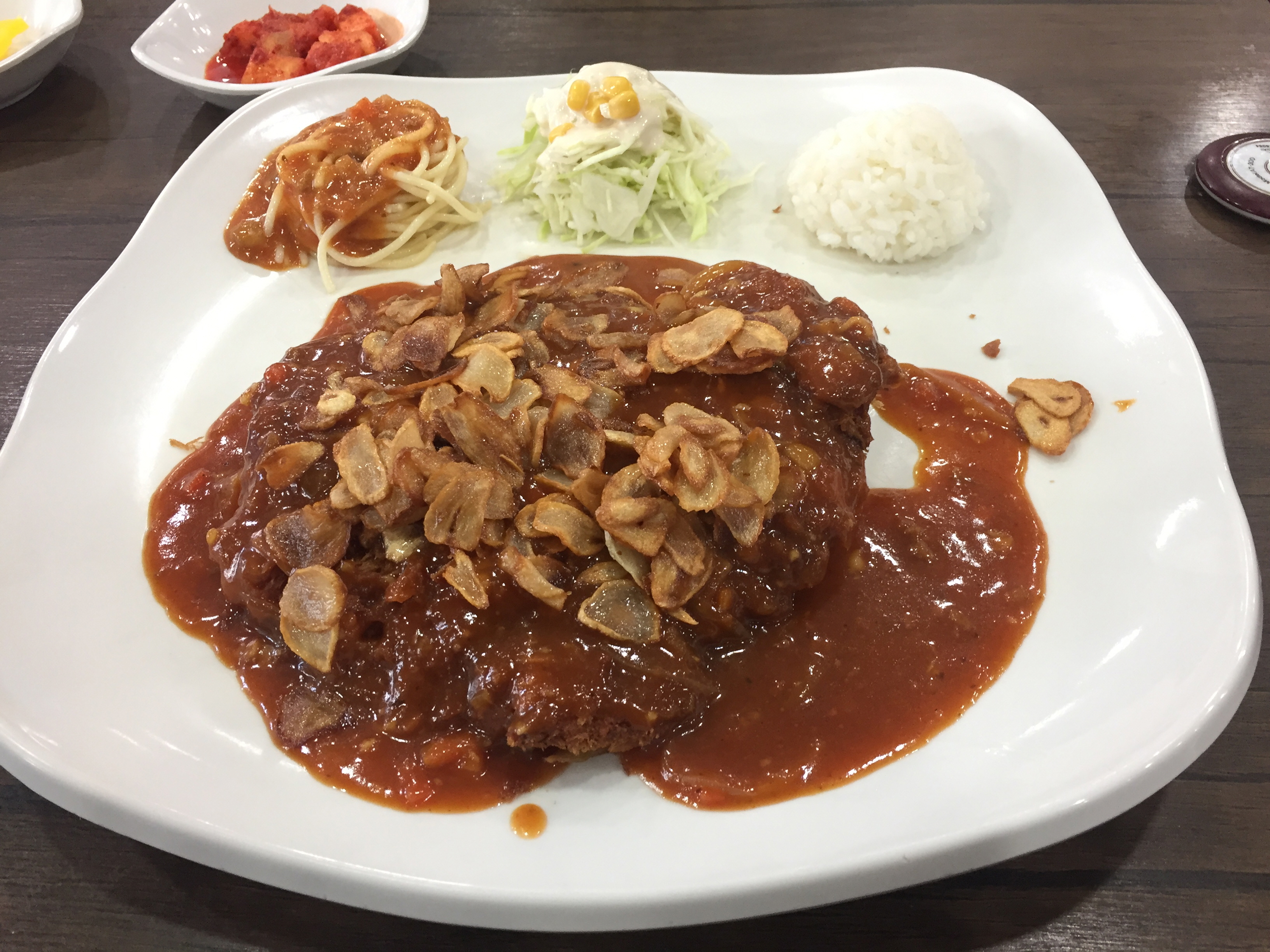 잠시 후 칠리소스를 돈가스 위에 얹고 마늘 플레이크를 얹은 칠리마늘돈까스가 나왔습니다.