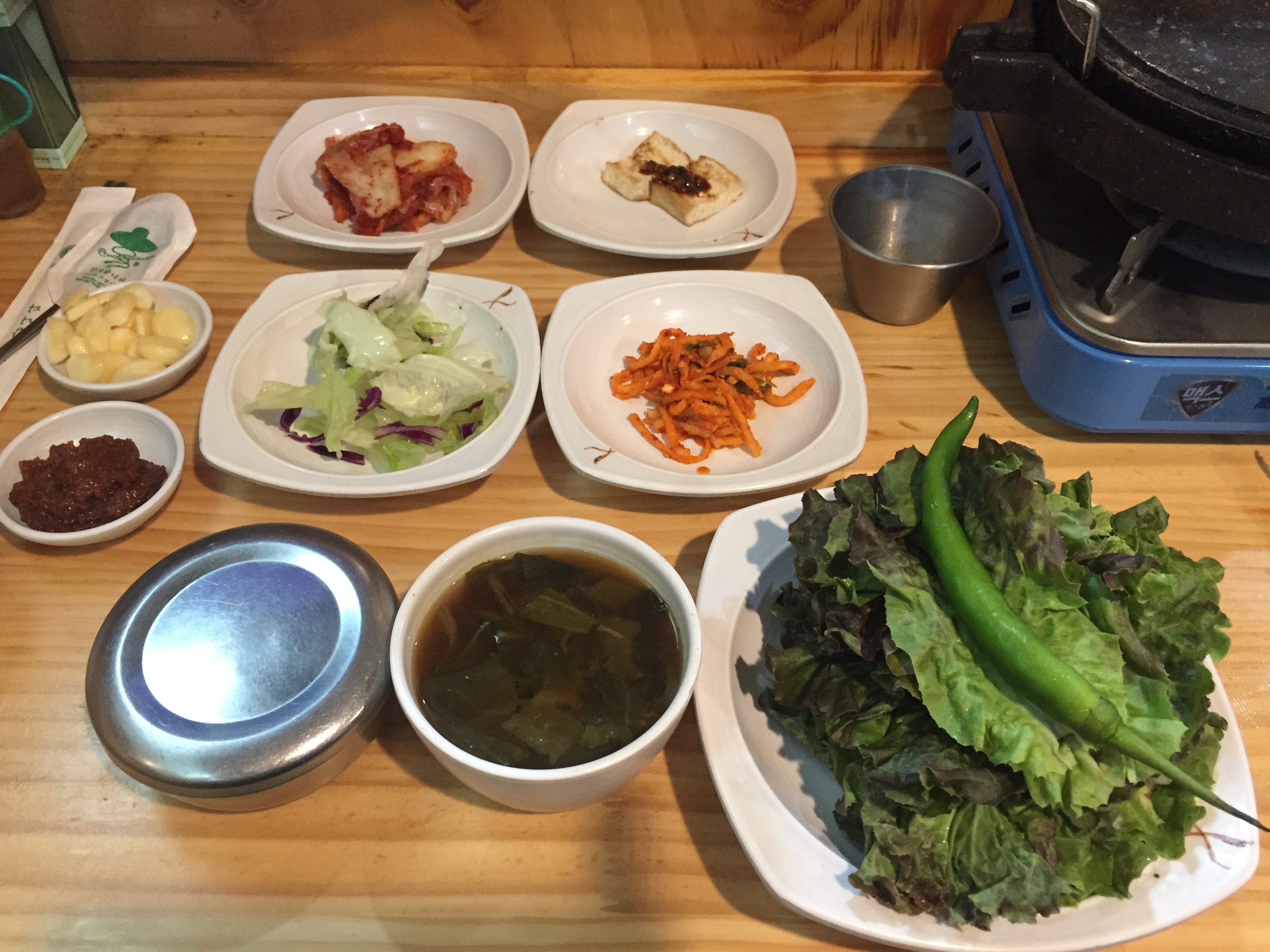 상추를 비롯해서 각종 밑반찬을 준비하고