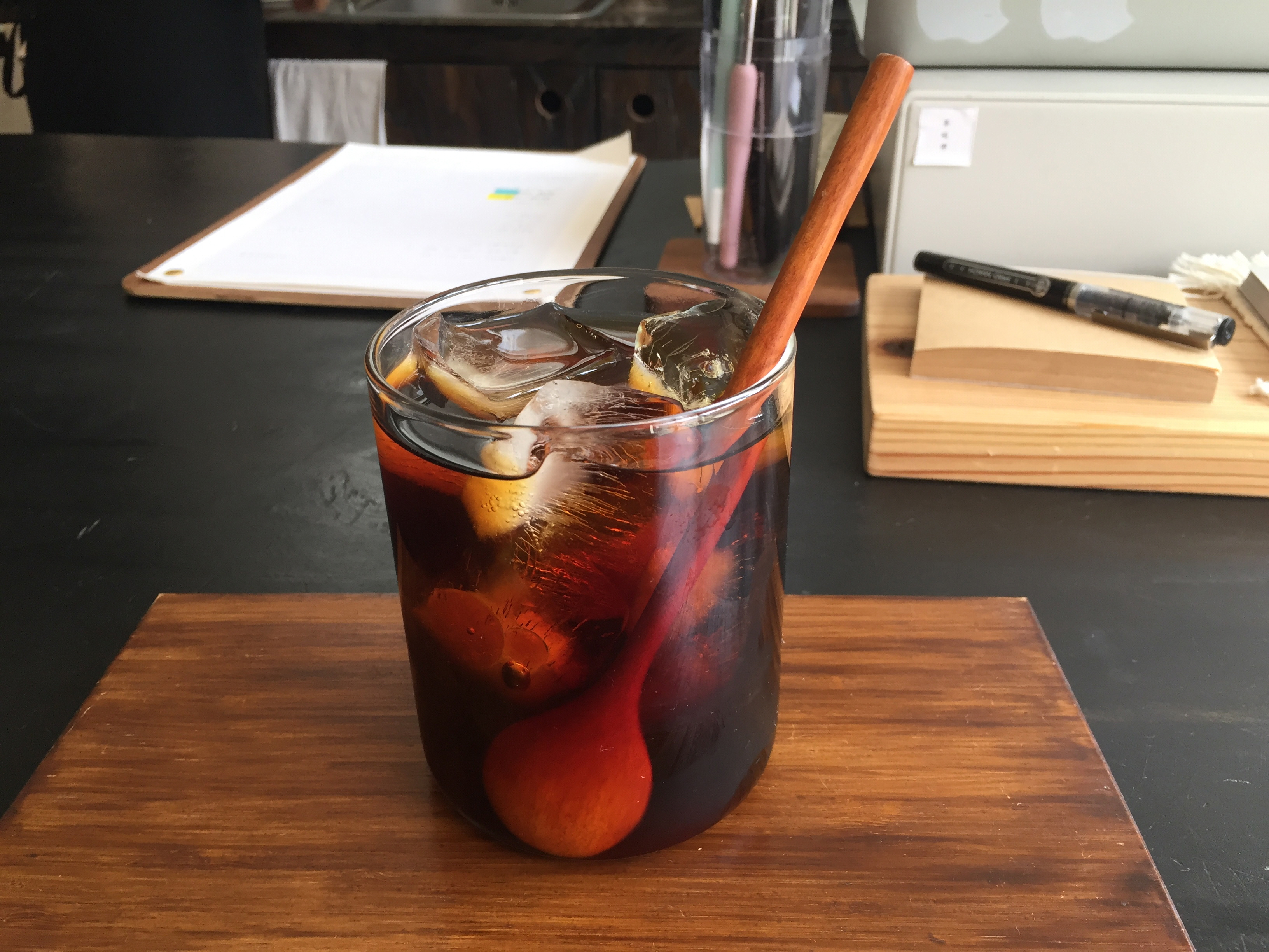 얼음을 채운 컵에 부어 콜드 브루를 내었습니다.