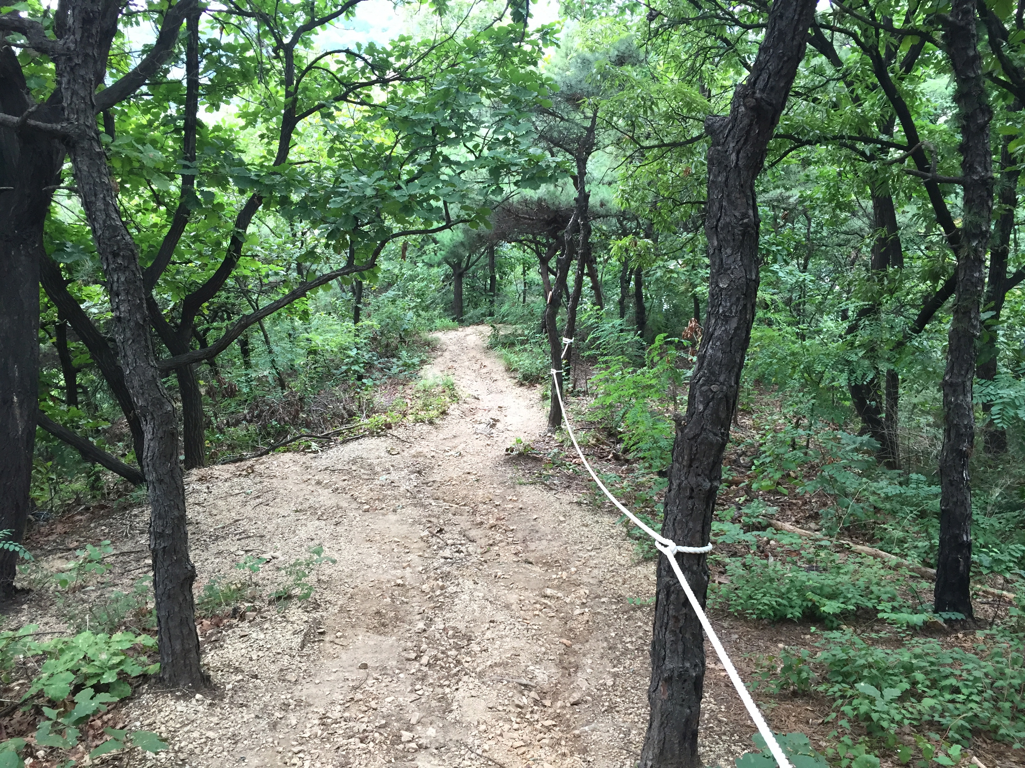 미끄럼 방지용인지 나무마다 걸린 밧줄을 보면서 내려가