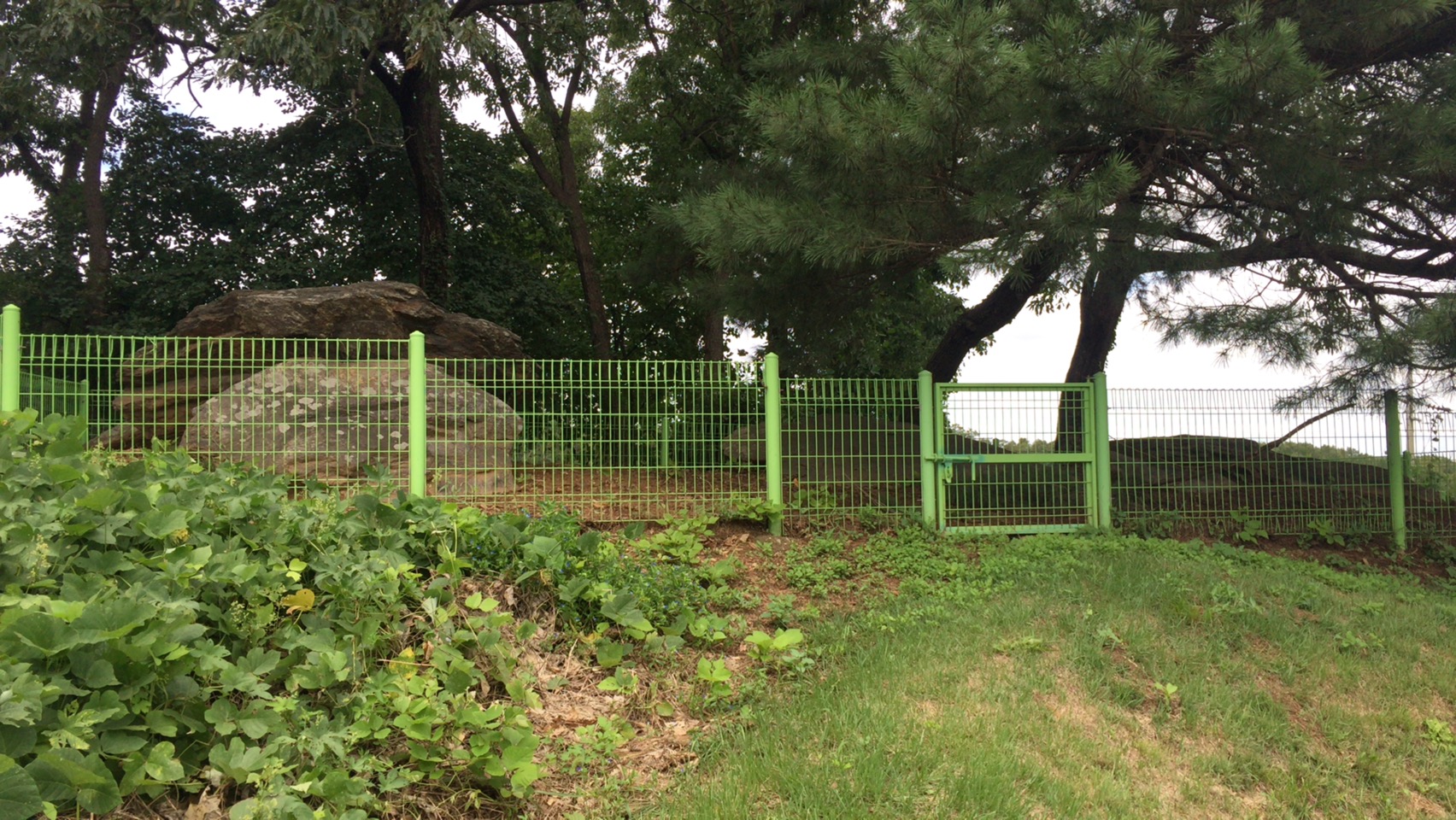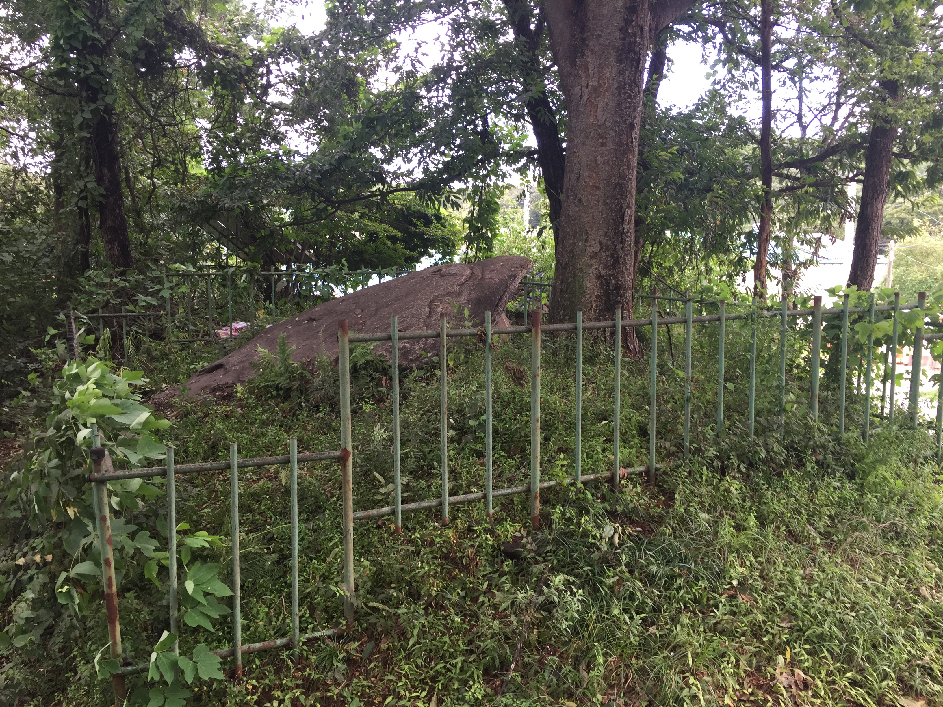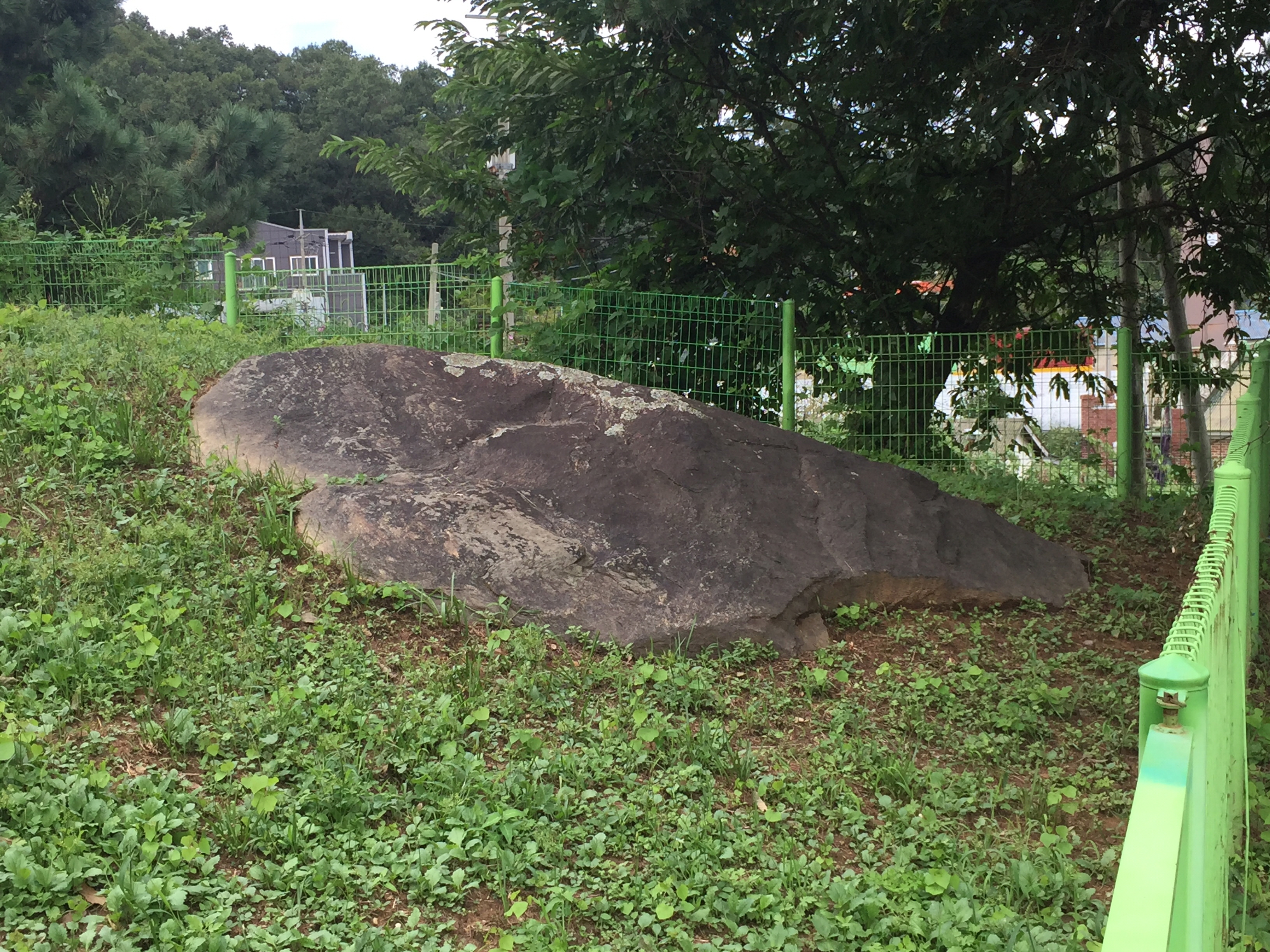 울타리로 보호 중인 커다란 돌덩이를 보러 돌아다닙니다.