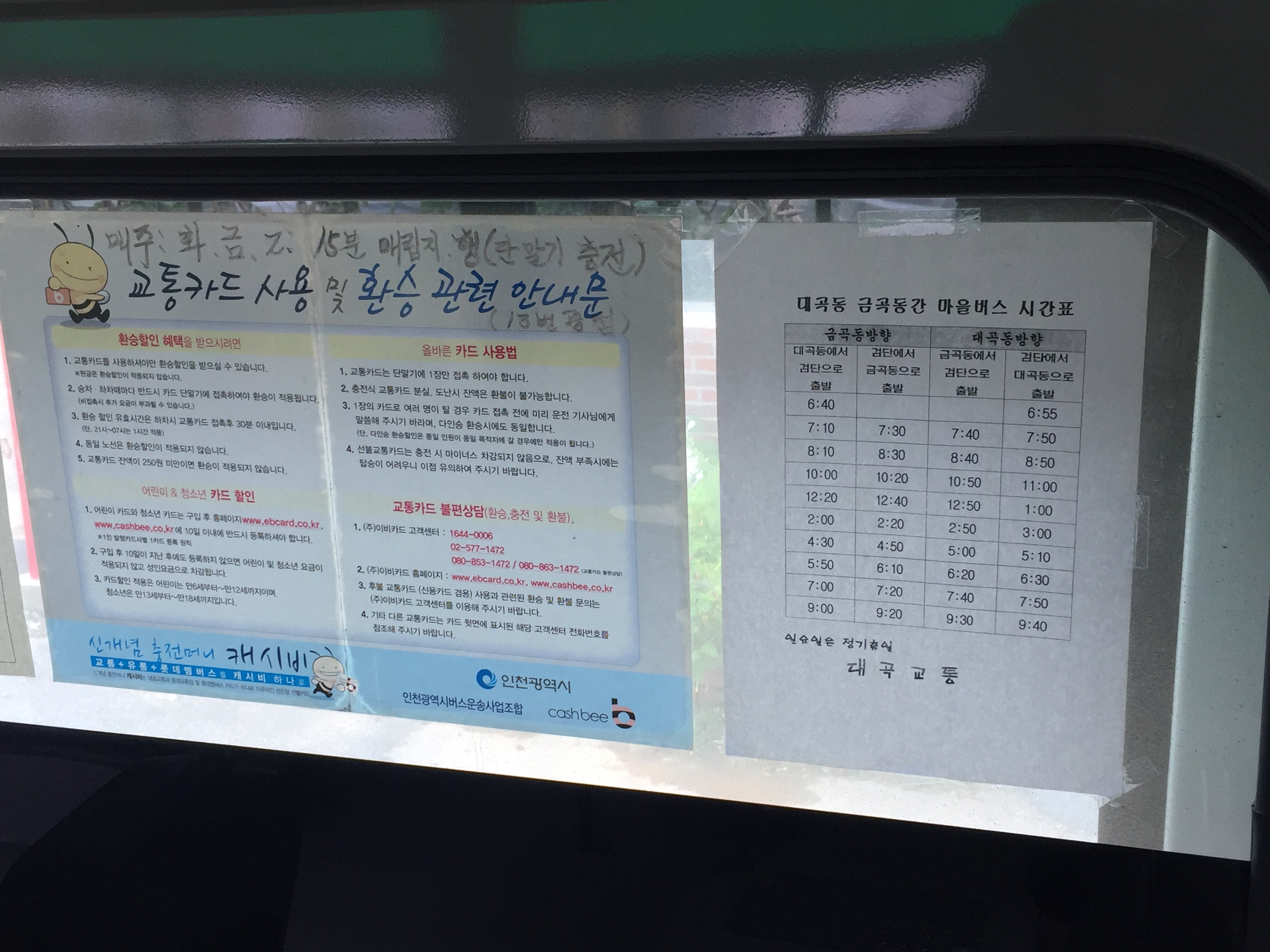 버스에 올라타 대곡동으로 올 때 놓친 버스 시간표를 사진에 담아 봅니다.