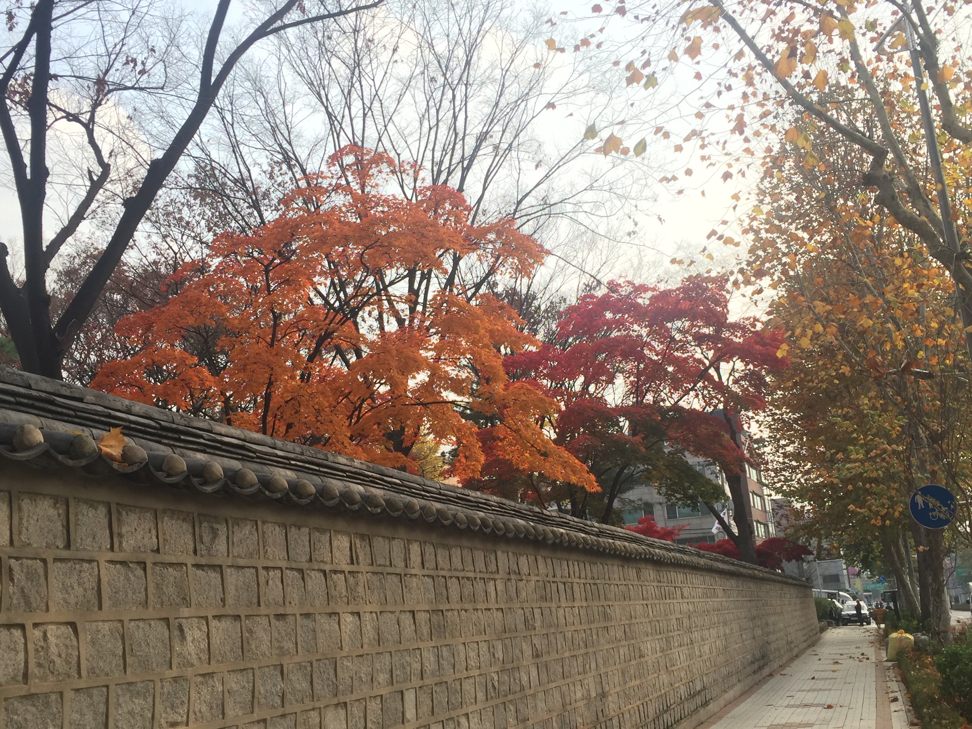 고풍스러운 담벼락 위로 물든 단풍을 보며 걷다 보니
