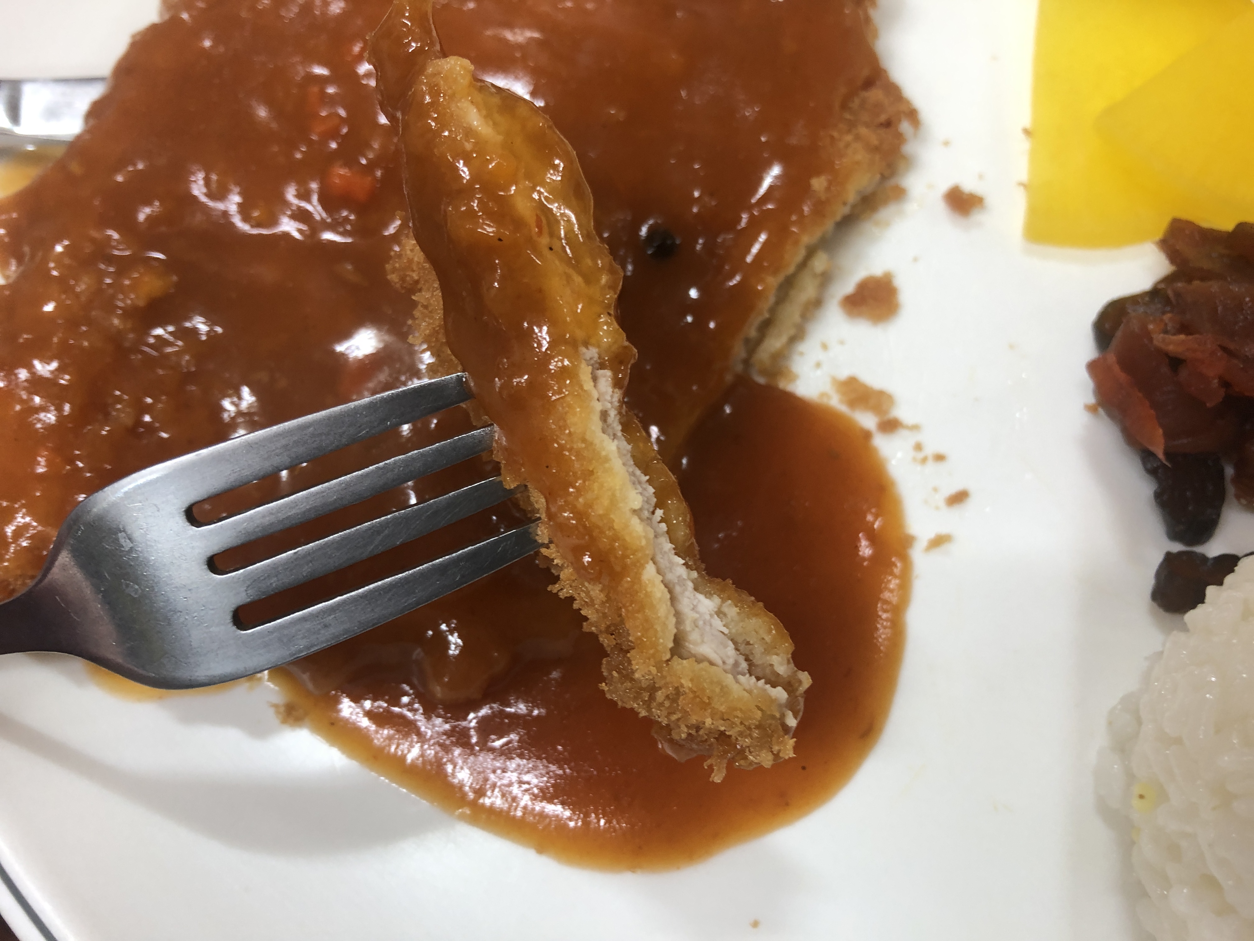 경양식 스타일로 얇고 크게 편 돈가스를 썰어 매콤한 소스를 듬뿍 묻히고 먹어봅니다.