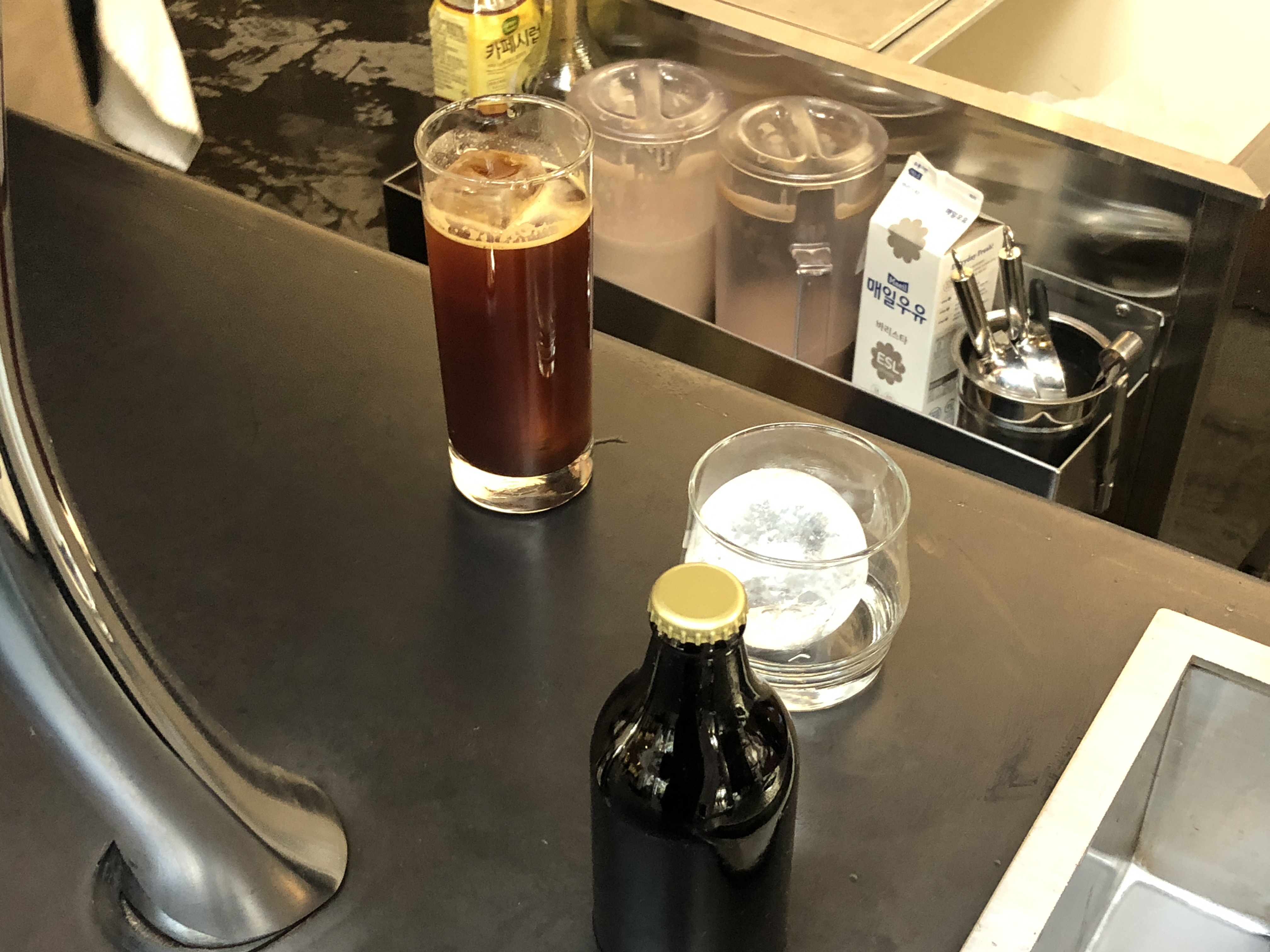 둥그런 공 모양으로 꽝꽝 얼린 얼음이 담긴 잔과 함께 콜드 브루 병을 받고 자리에 앉아