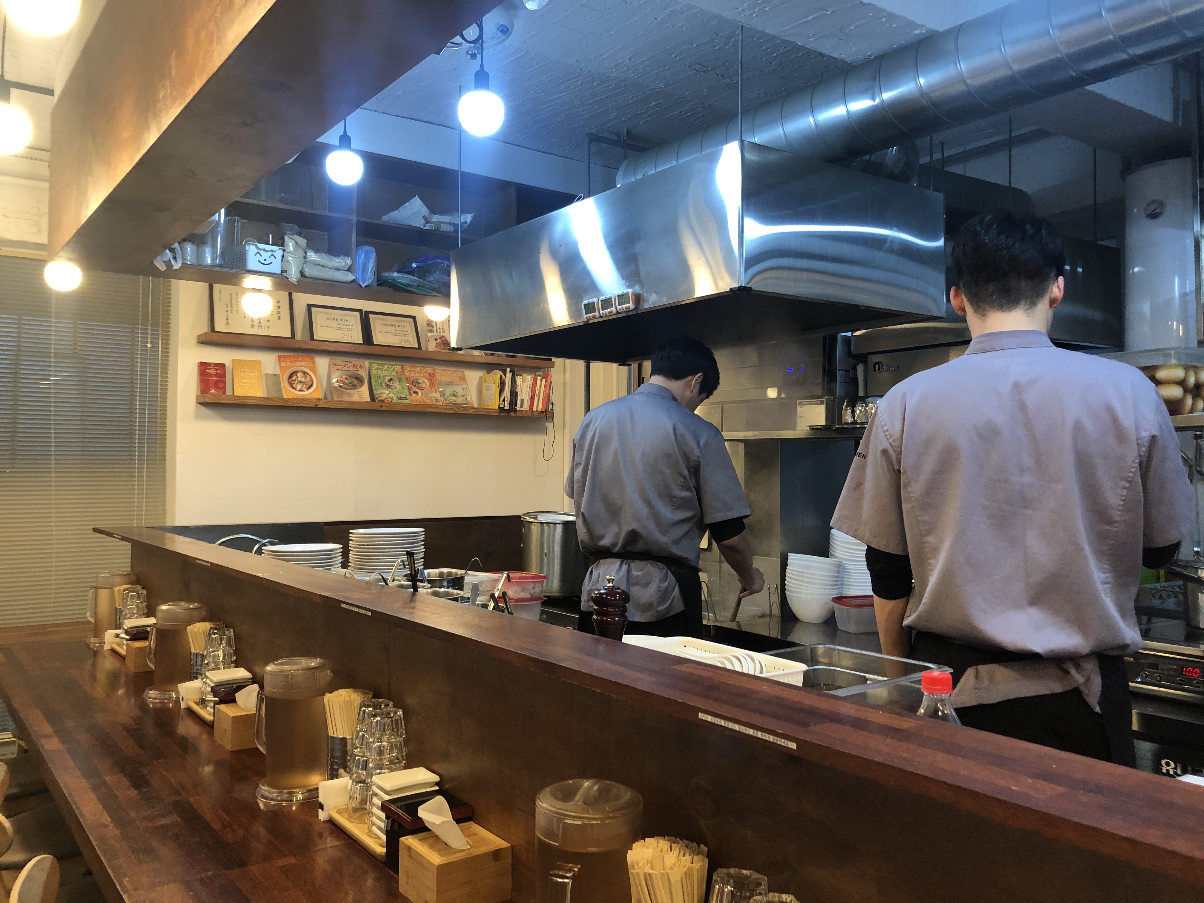 식권을 낸 뒤 자리에 앉아 라멘이 나오기를 기다립니다.