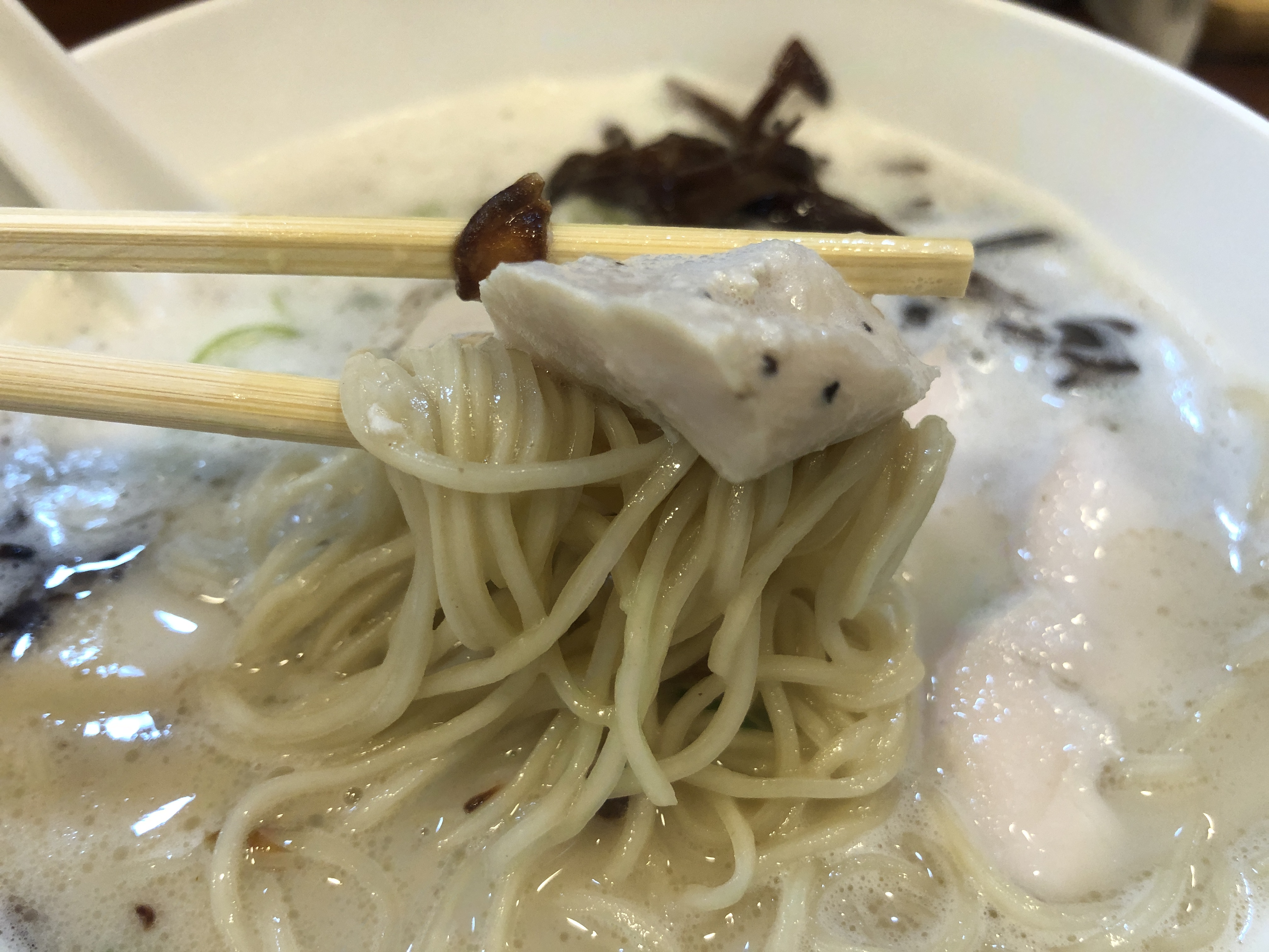 고명으로 올라간 닭 안심살을 집어 라멘과 같이 먹으니