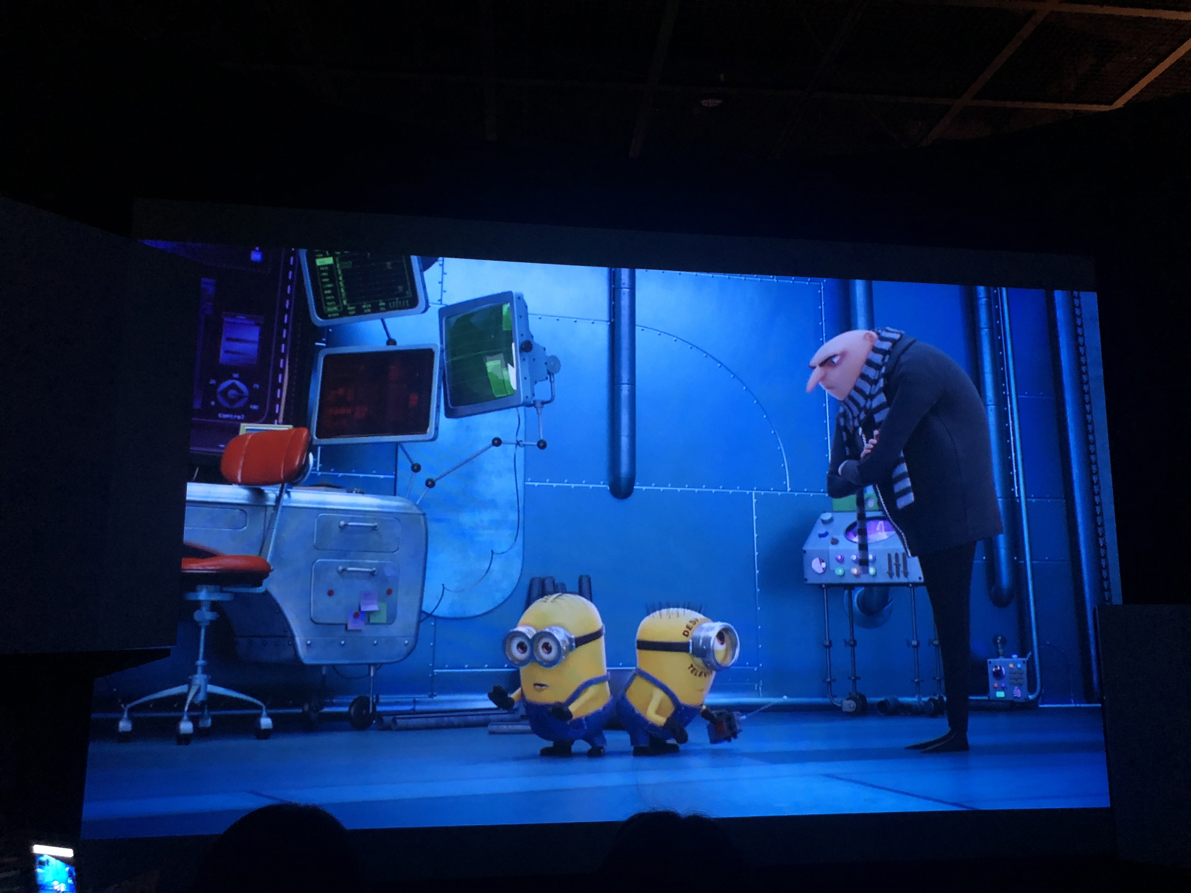 입장한 뒤 슈퍼배드 1~3과 미니언즈 주요 장면을 담은 영상을 보느라 입장 인원을 통제하고 있네요.