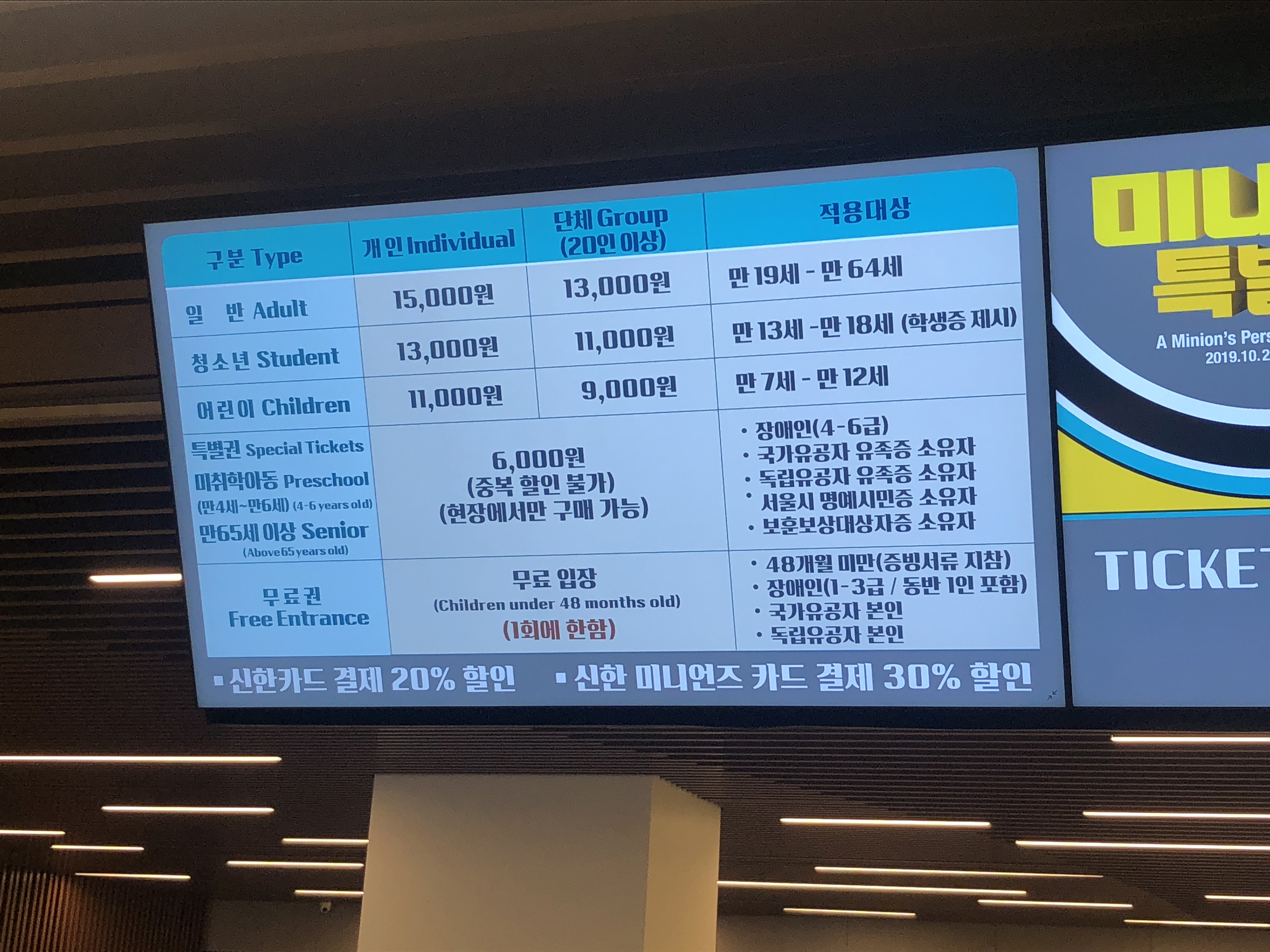 미니언즈 카드를 만들어두긴 했지만 입장료 정보를 미리 알고 오지 않아 집에 두고 왔으니