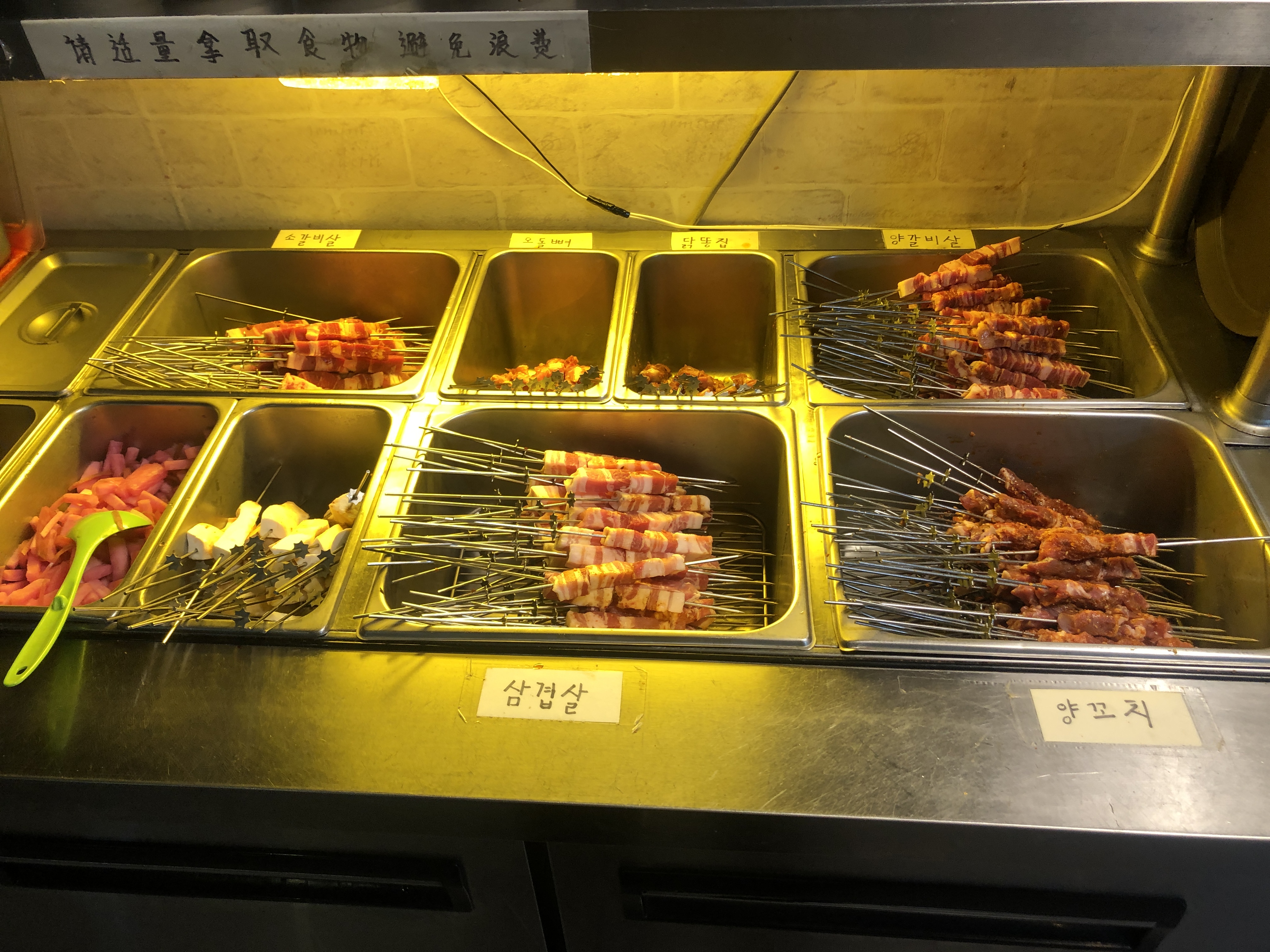 첫 번째 접시에 담아온 꼬치를 다 먹어서 셀프바에서 꼬치를 가져가려고 보니