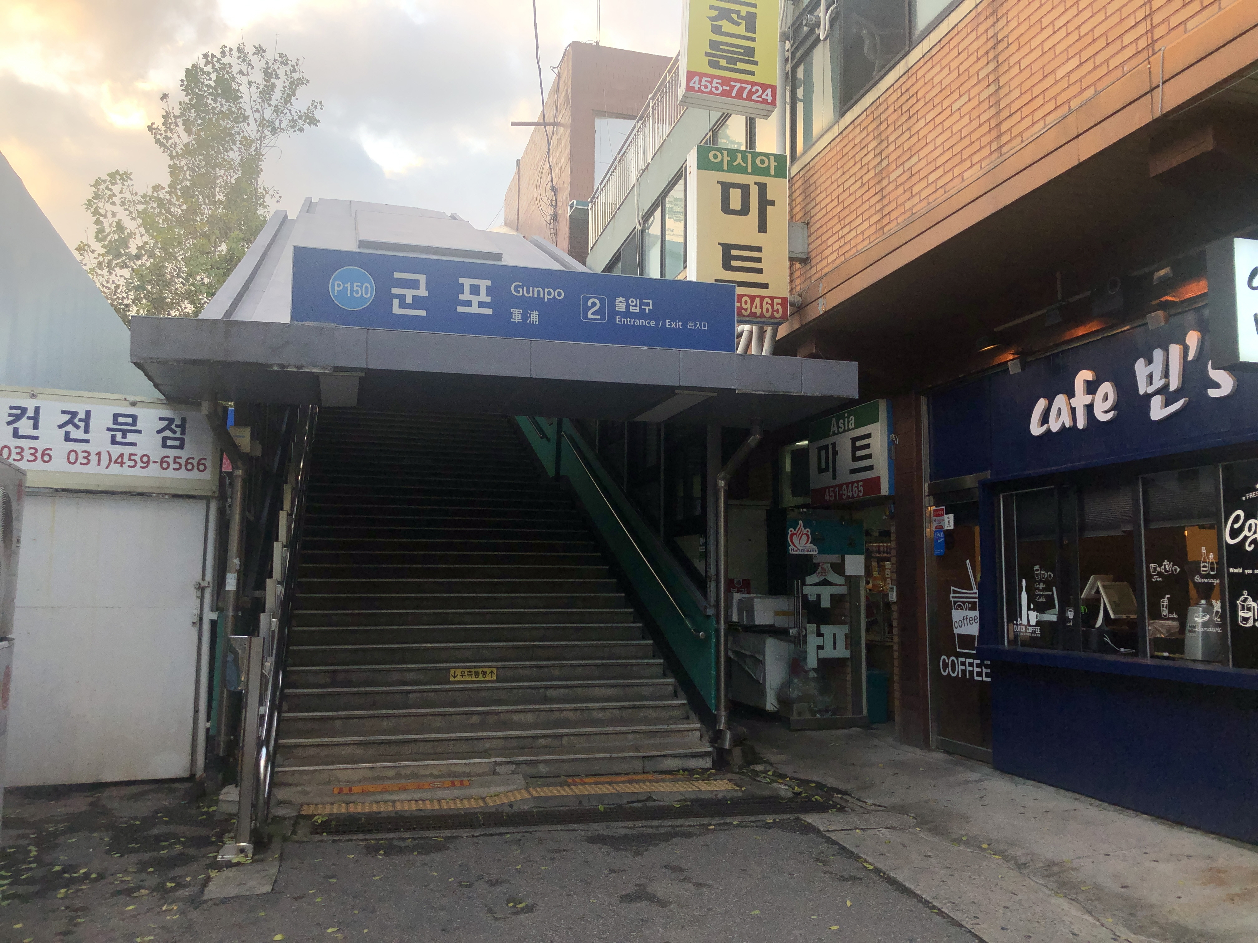 군포역에 내려 산본신도시 방향 1번 출구가 아닌 공장으로 나가는 2번 출구로 나와