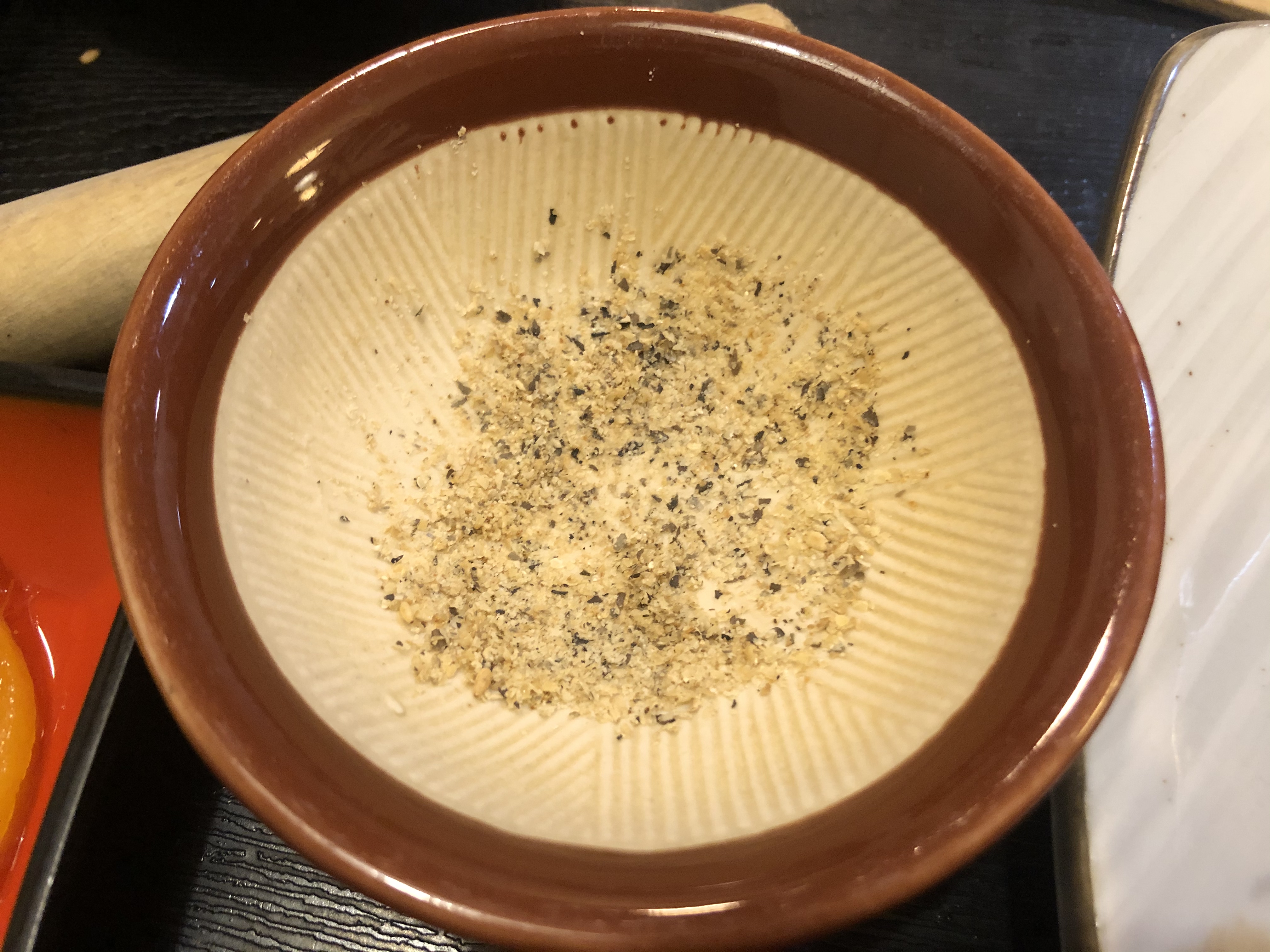 갈색 통을 집어 돈가스 소스를 막자사발에 듬뿍 붓고 깨와 잘 섞어줍니다.