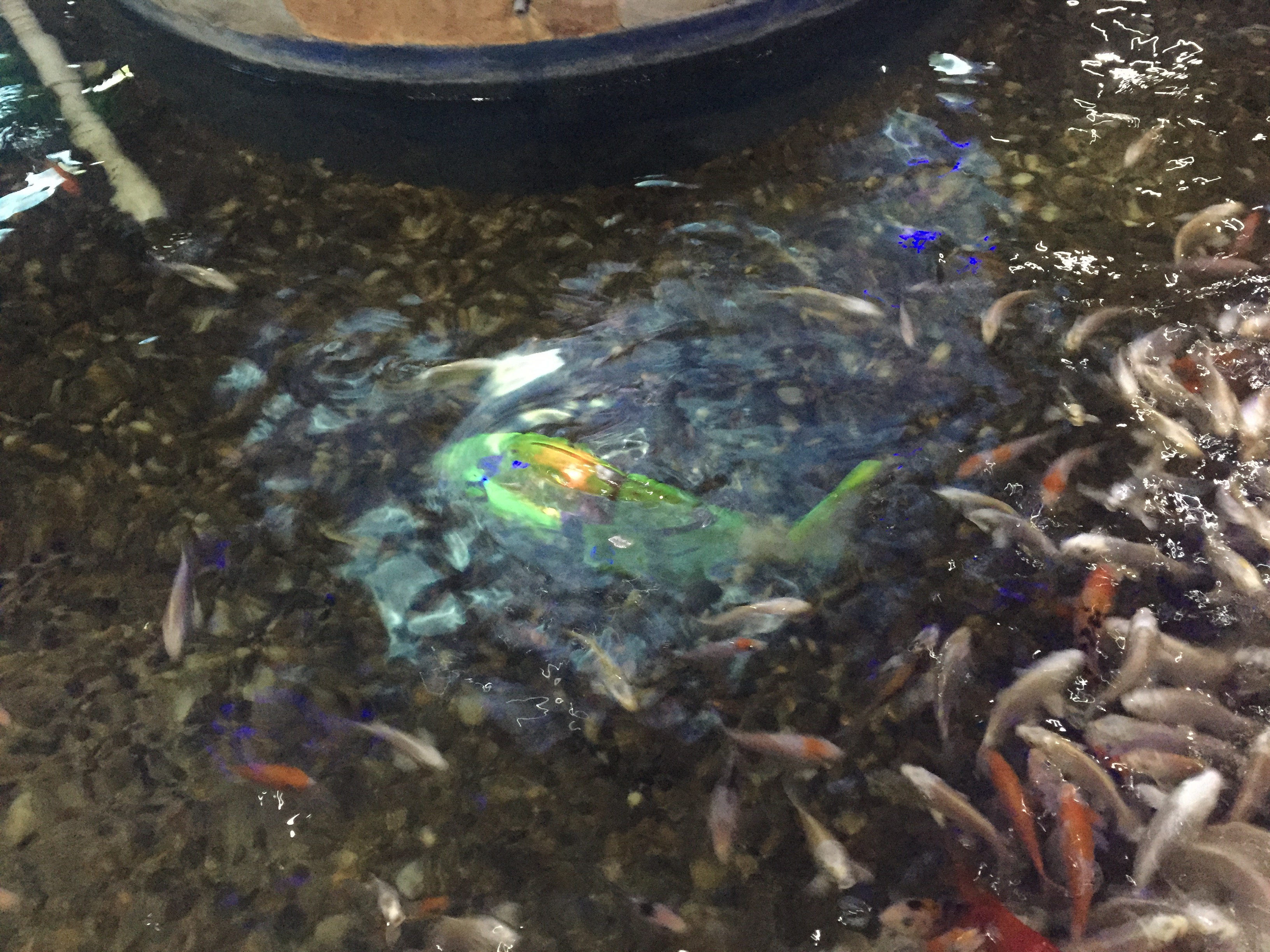 어린이들이 주는 먹이를 노리는 잉어 떼 사이에서 홀로 헤엄치는 로봇 물고기,