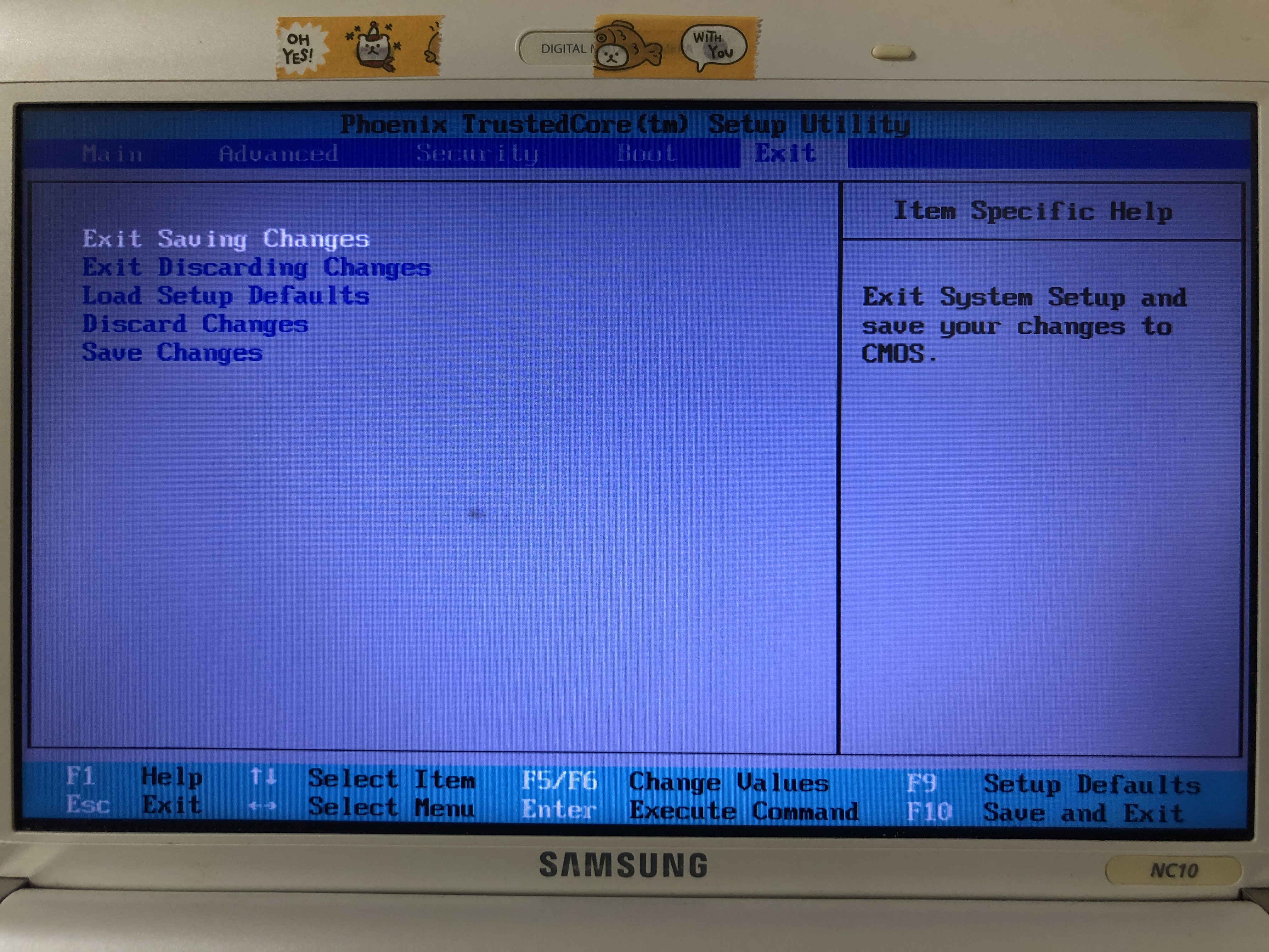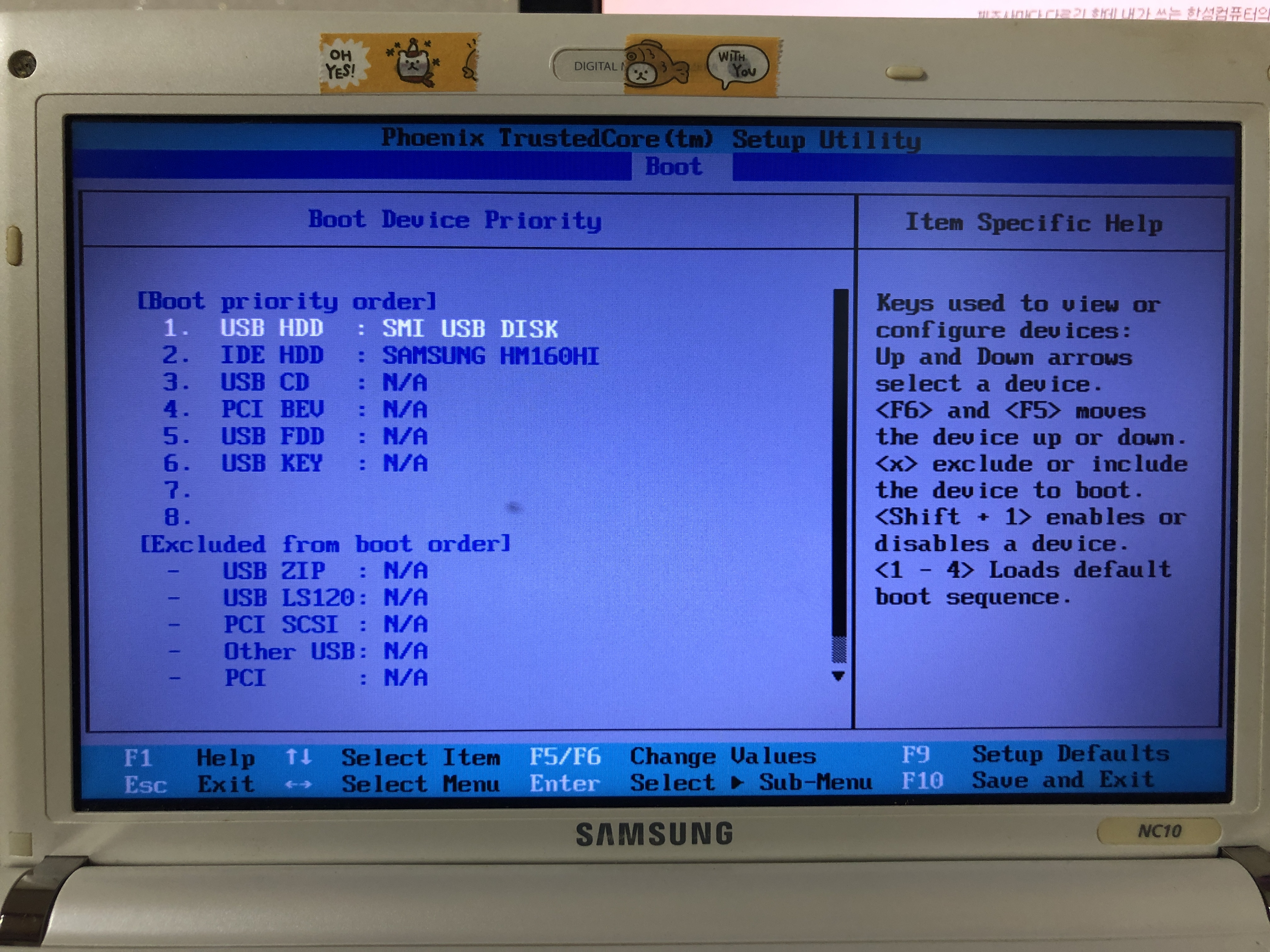 NC10에 연결한 뒤 USB로 부팅하려고 F2키를 연타해 바이오스로 들어갔는데