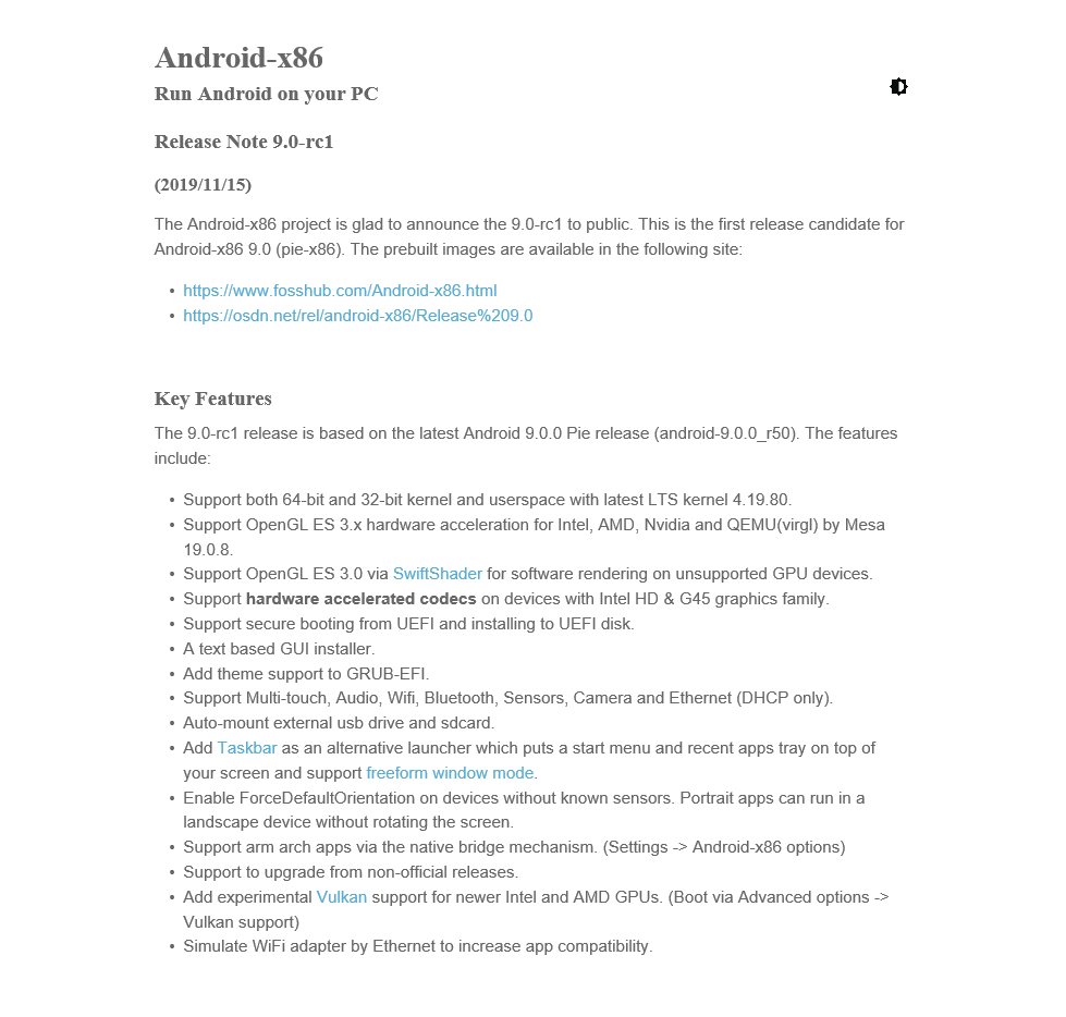 현재 배포 중인 안드로이드-x86 최신 버전은 안드로이드 9.0(파이) 기반의 9.0-rc2인데