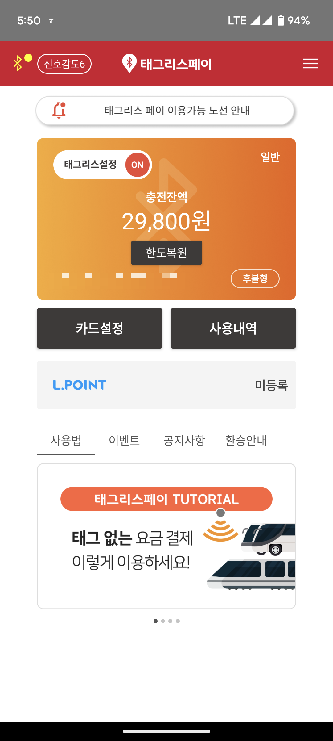 스마트폰에 있는 NFC 기능을 이용해서 잔액 및 이용내역을 조회할 수도 있습니다.
