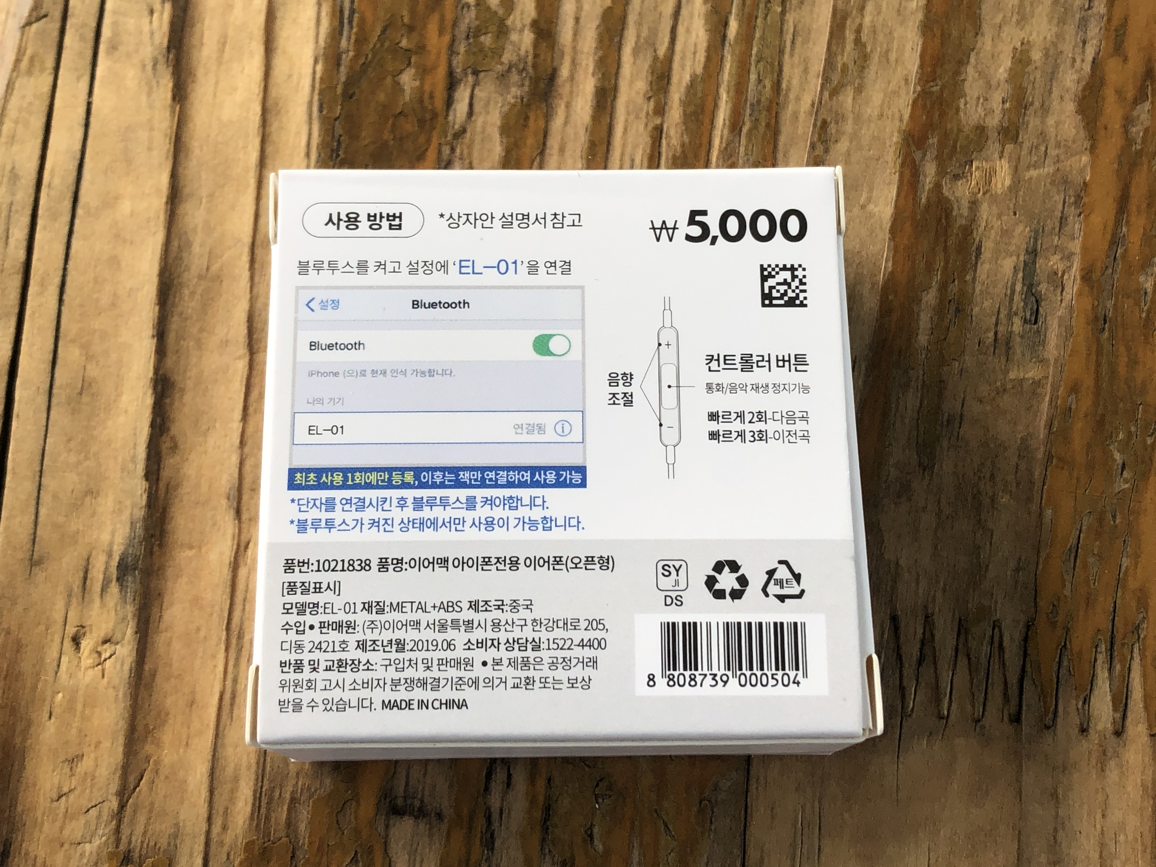 EL-01이라는 이 이어폰도 똑같이 케이블이 달린 블루투스 이어폰입니다.