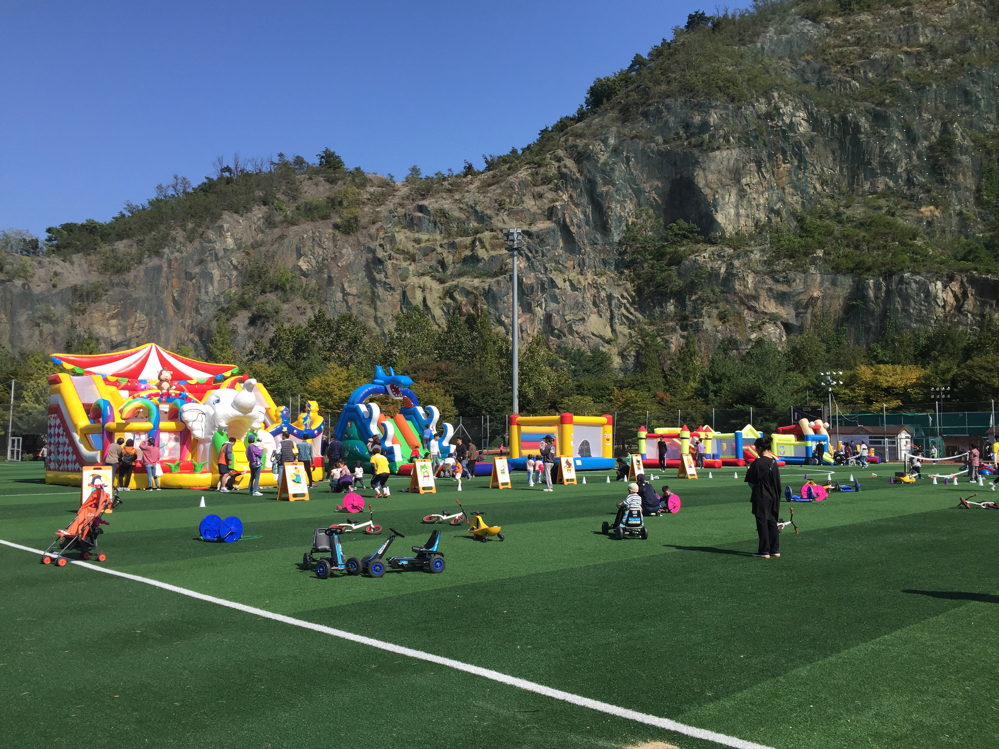 아찔하게 깎인 절벽 아래 놓인 축구장 옆을 걷고
