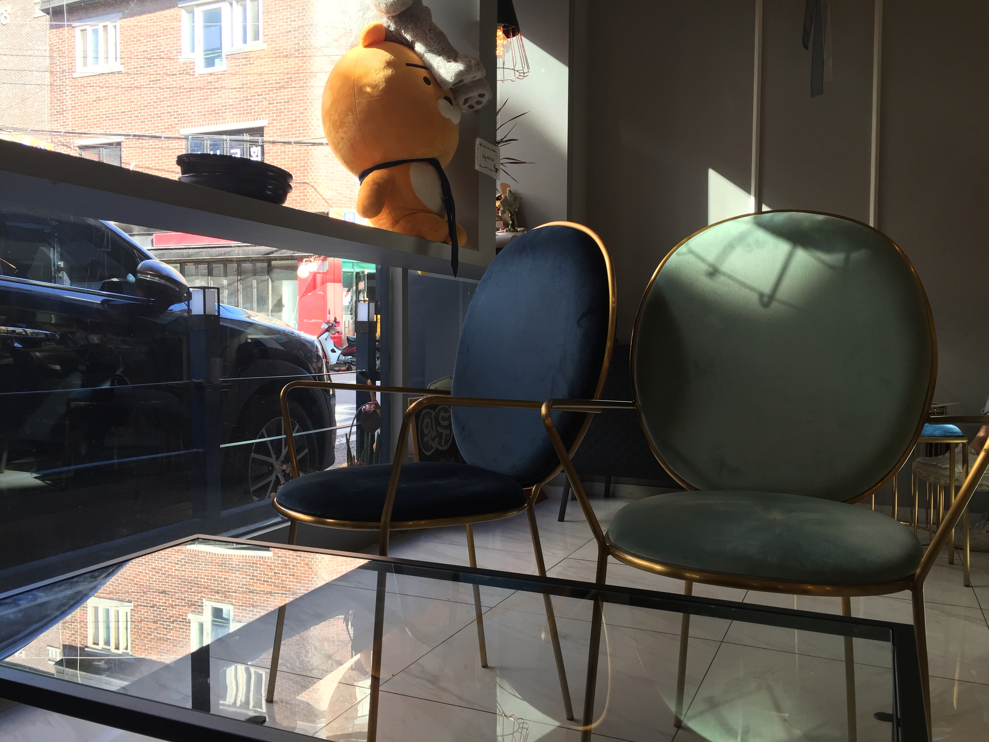 넥타이를 조금 이상하게 맨 라이언 인형을 보며 자리에 앉으니