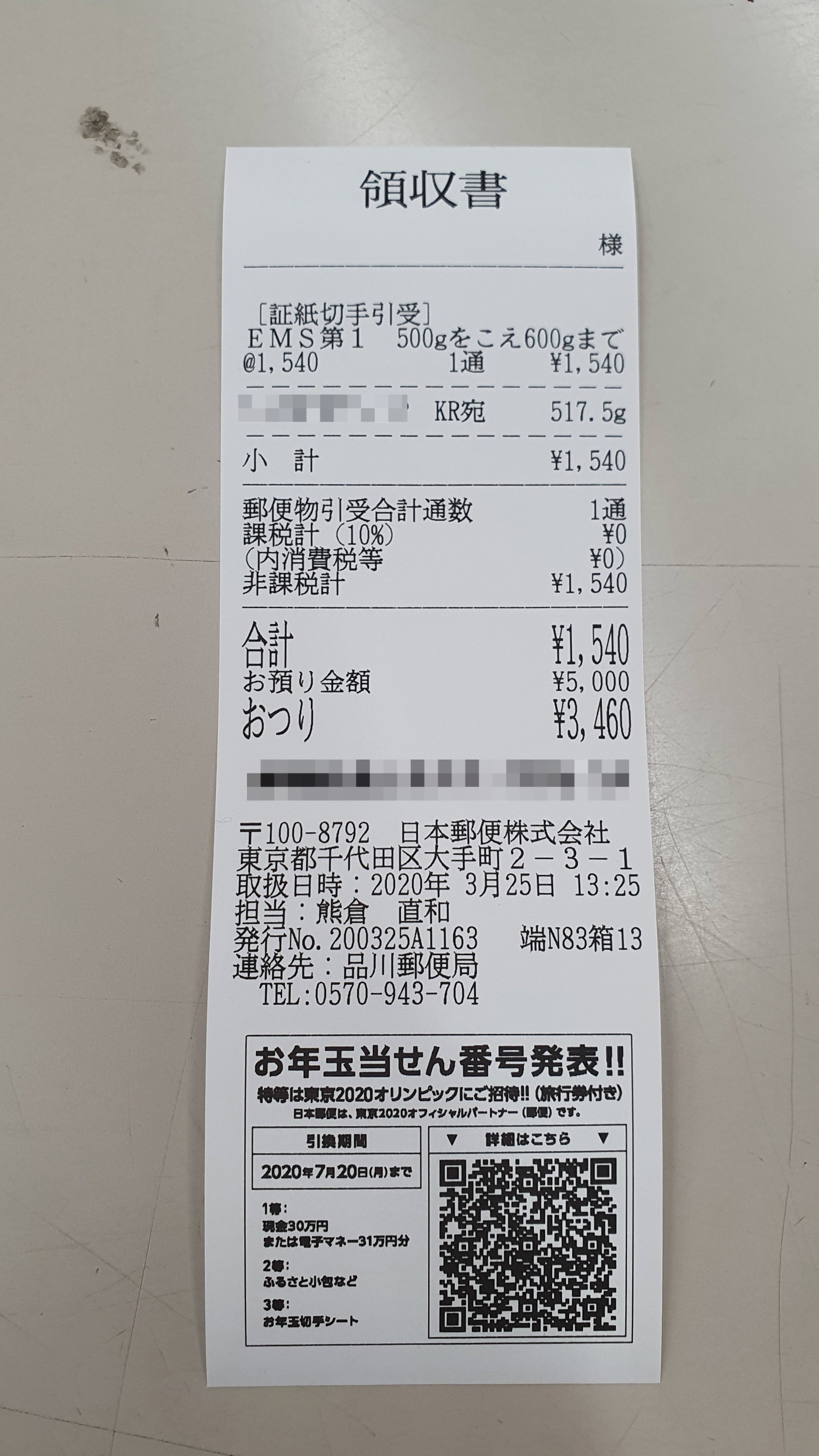 인보이스 작성까지 마치고 무게를 잰 뒤 나온 요금은 1,540엔.