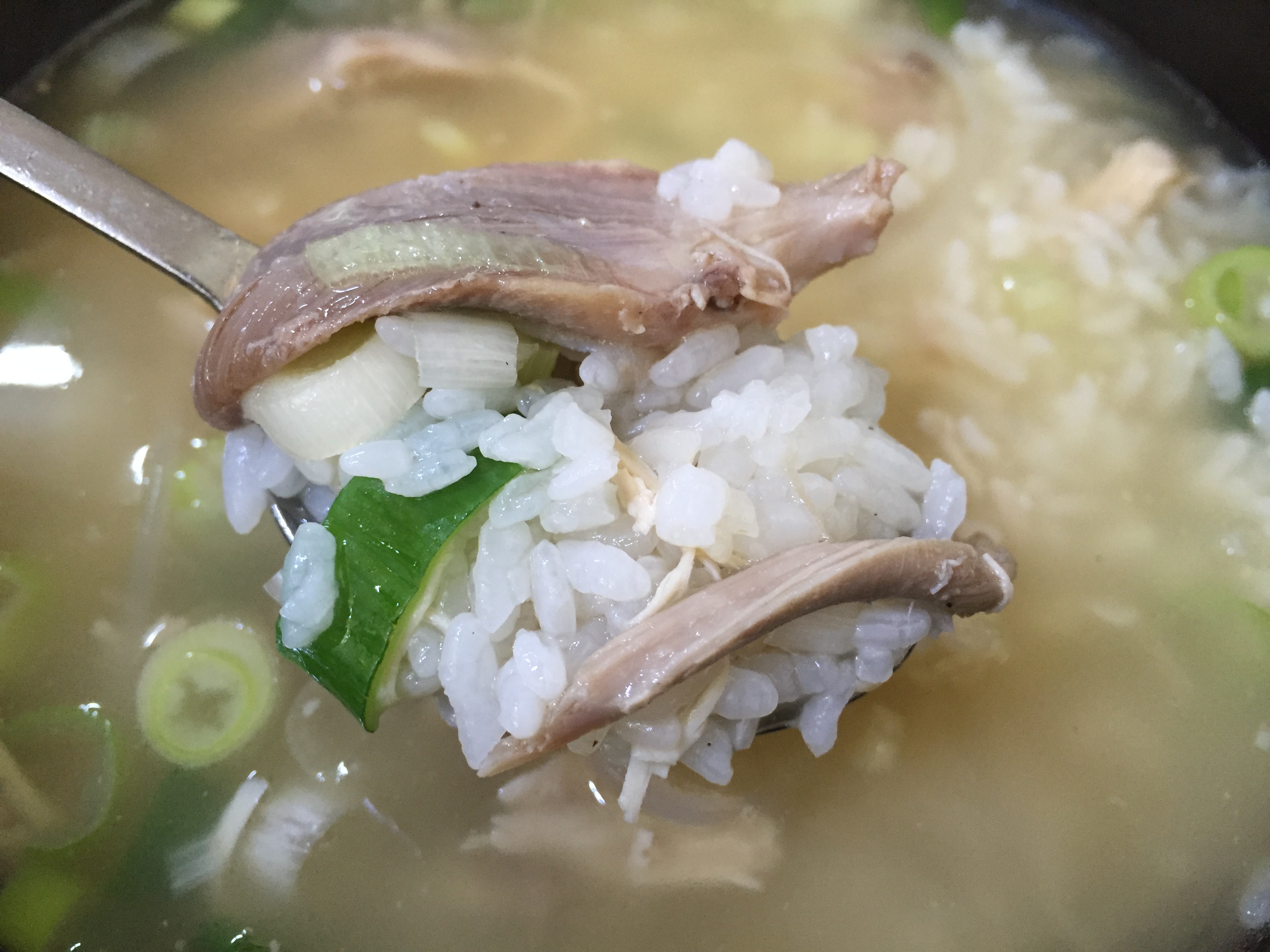 밥을 말아서 국물이 잘 밴 밥과 함께 닭고기를 먹고