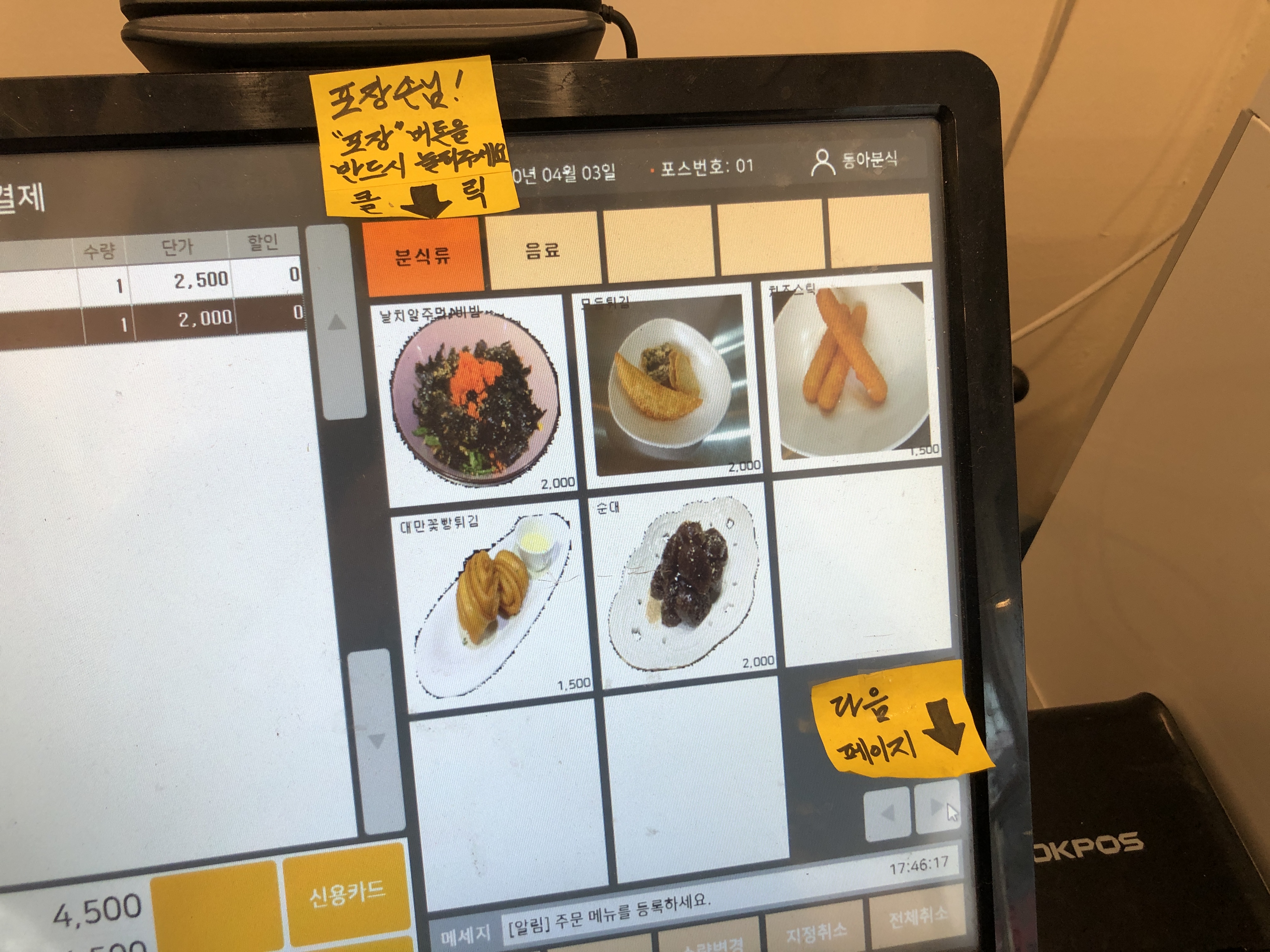 가격은 탕수육 2,500원에 잔치국수 2,000원 총 4,500원.