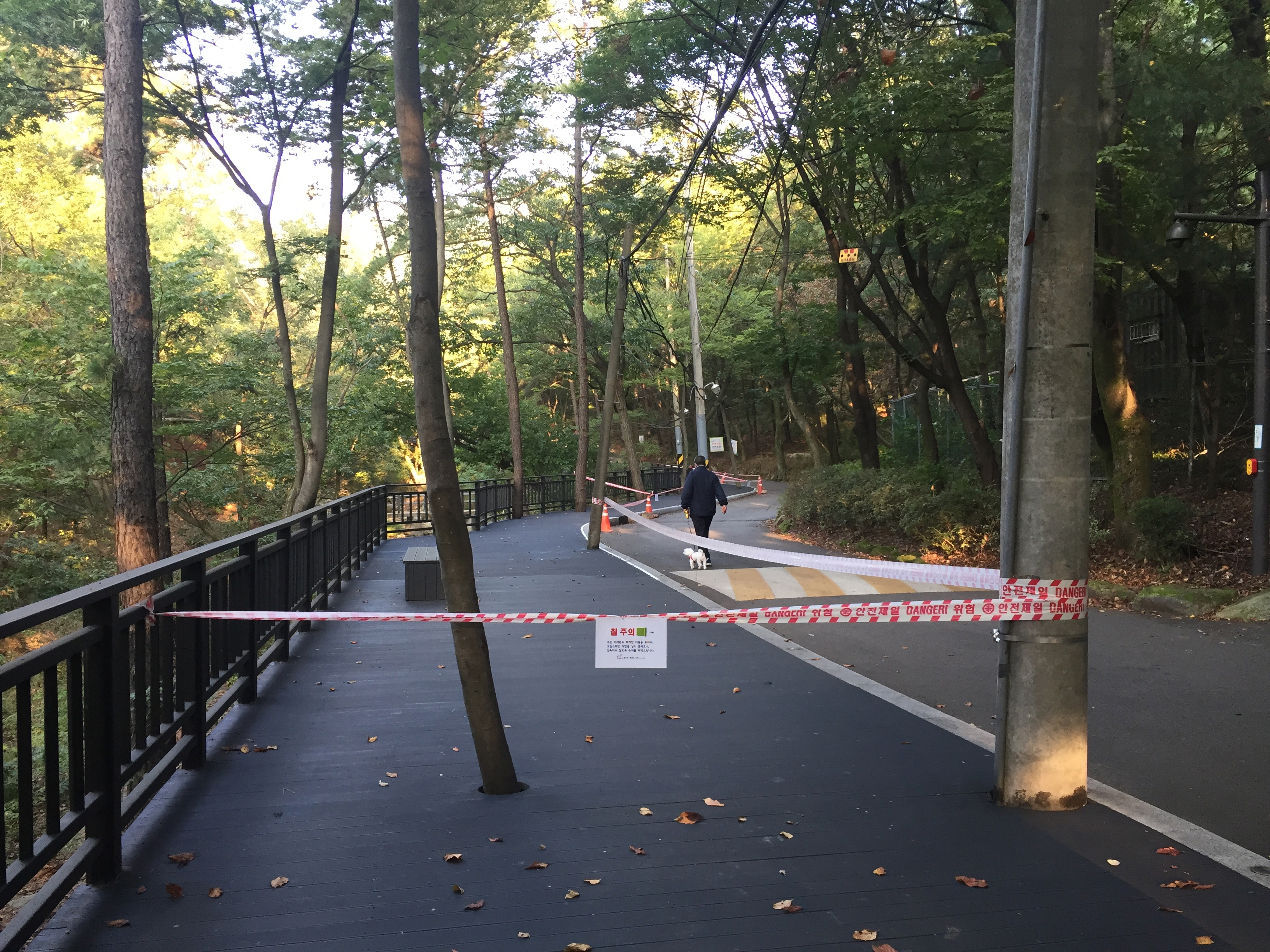 오일스테인을 칠한다고 통행을 막아둔 데크를 피해 차도로 걷고