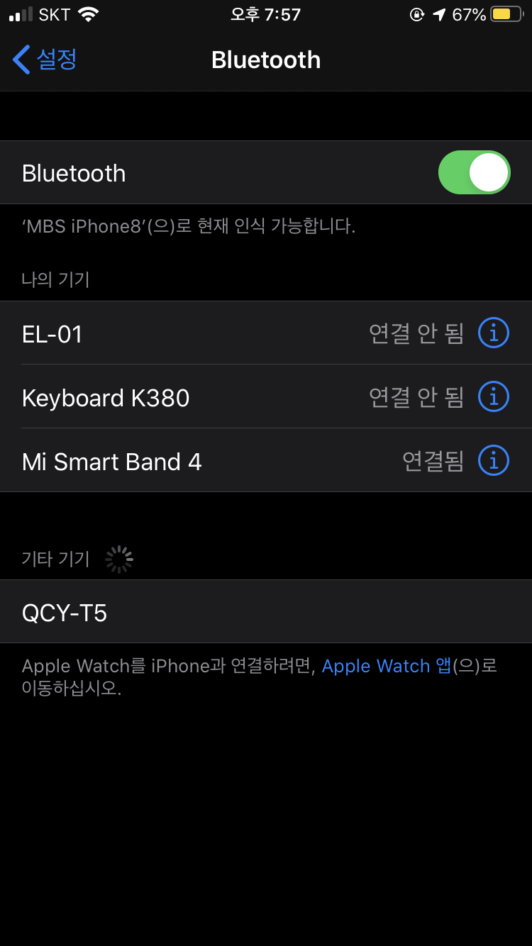 블루투스 설정에서 QCY-T5를 고르면 바로 연결이 됩니다.