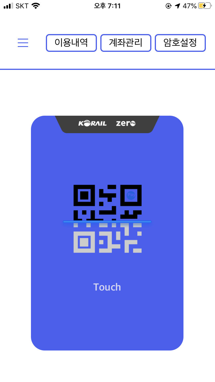 교통카드 기능에 더해 코레일 제로페이 결제를 이용할 수 있습니다.