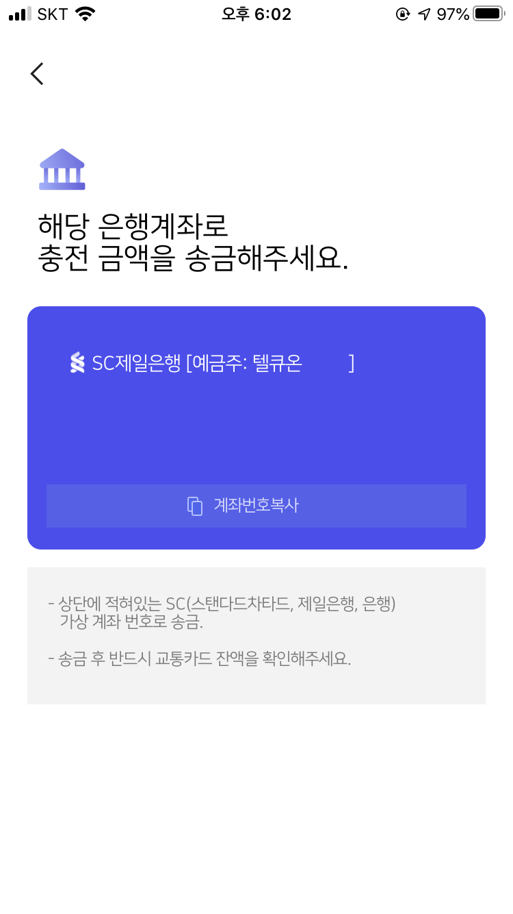그러니 SC제일은행 가상계좌 입금으로 충전했습니다.