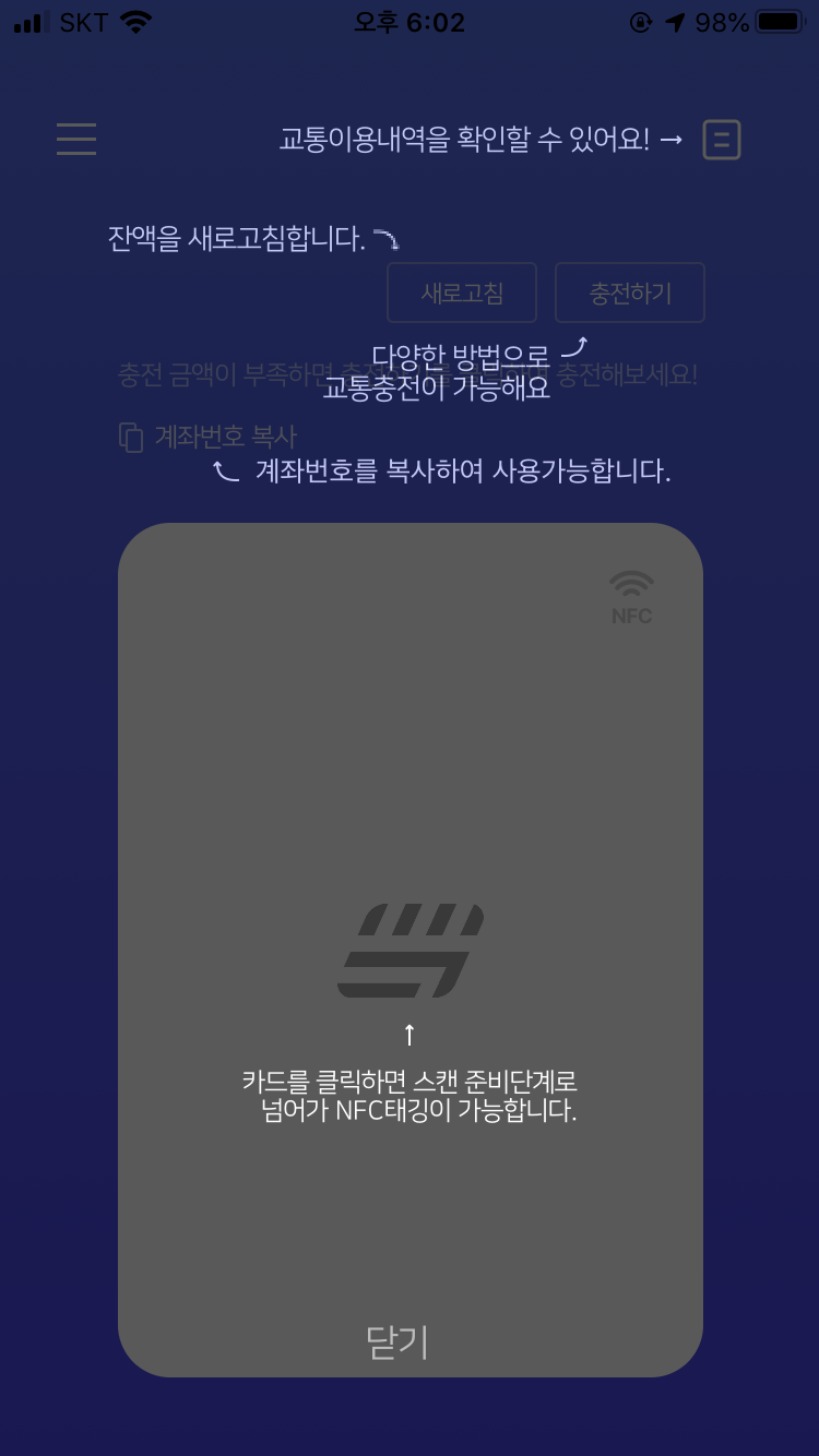교통카드를 쓰기 전에 앱을 켜서 결제 준비를 해야 한다는 번거로움이 큽니다.