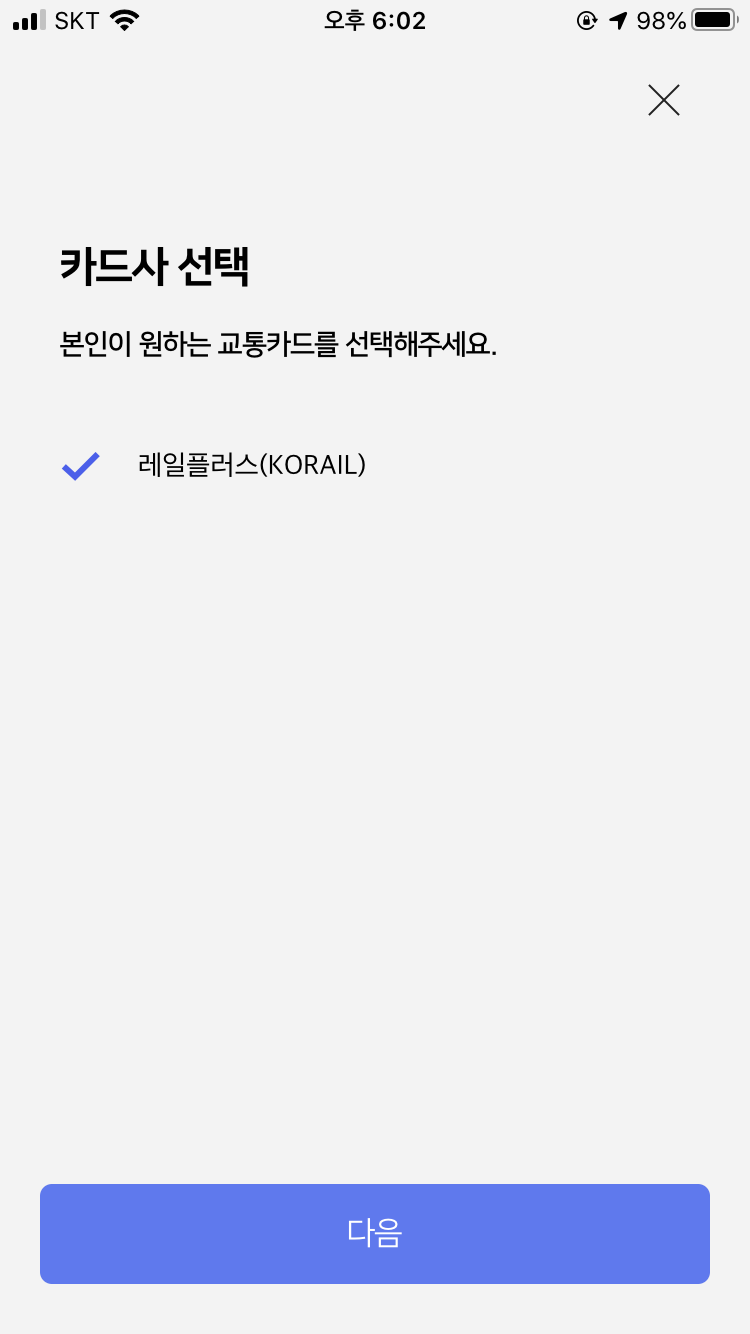 카드사 선택에서 삨이 아닌 레일플러스가 뜹니다.