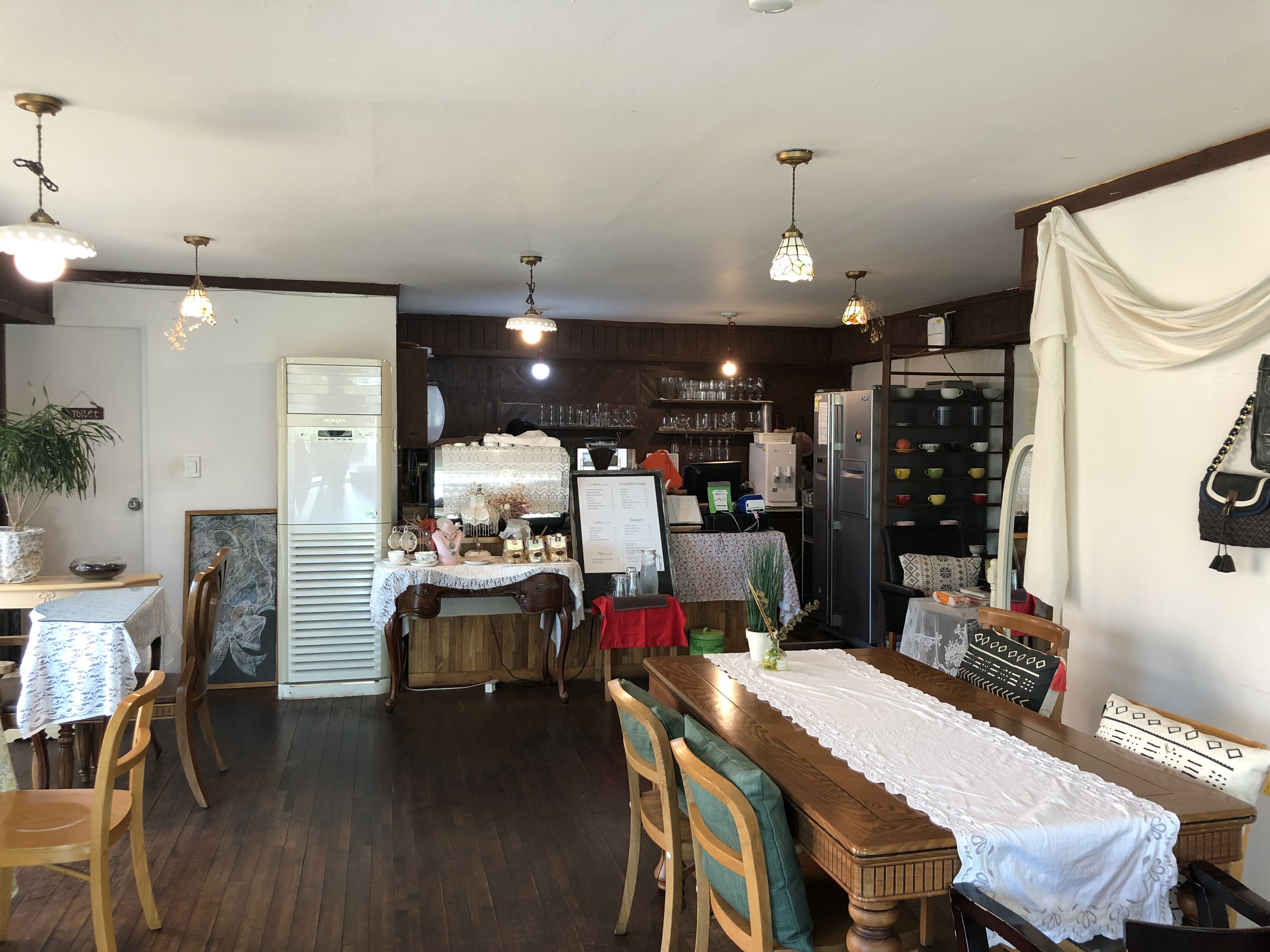 레이스 식탁보나 커튼, 별의별 인테리어 소품, 그리고 환한 햇빛 덕에