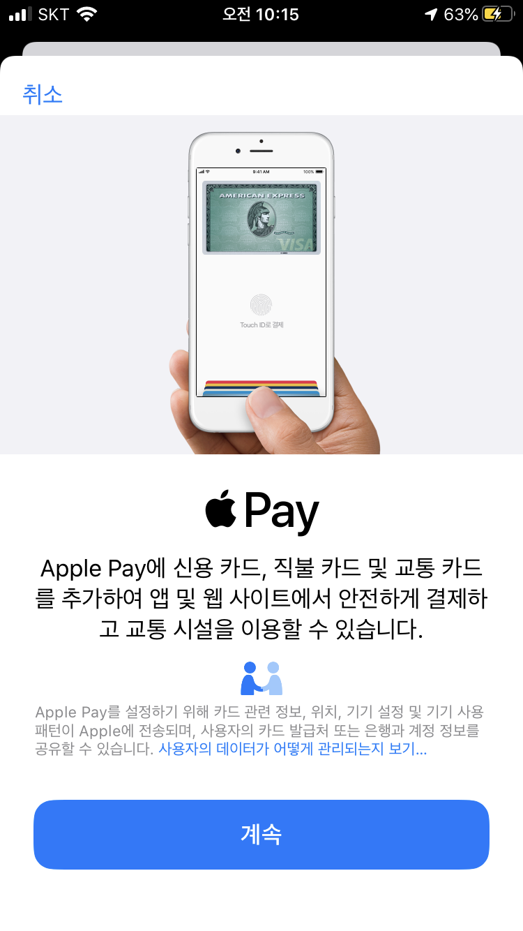 애플페이 안내 화면에서 계속 버튼을 누르고