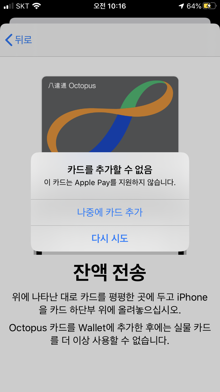 제가 가지고 있던 옥토퍼스 카드 중 일부는 아이폰으로 옮기는데 실패했는데요.