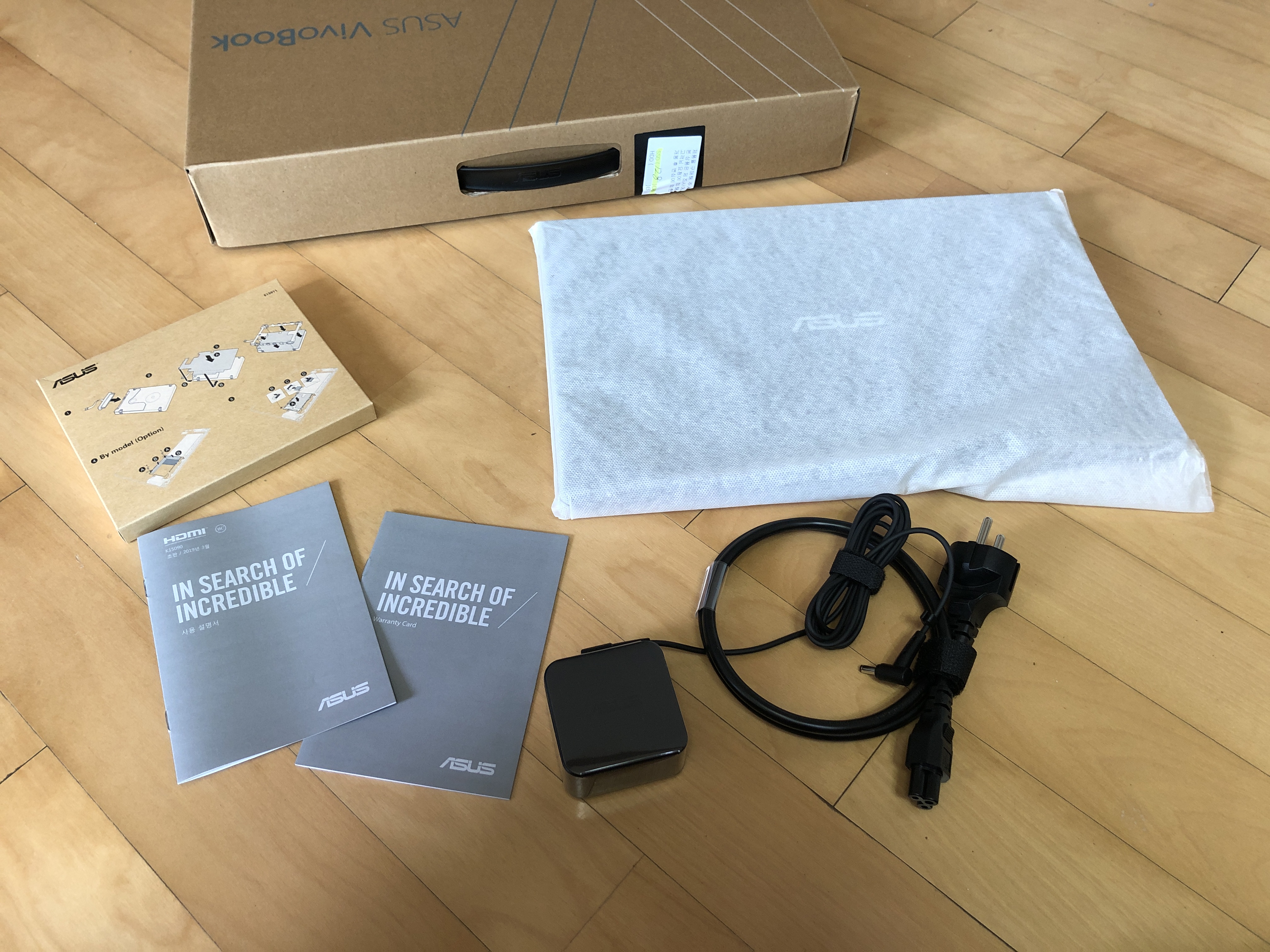 박스를 뜯어 내용물을 보면 천에 감싸진 노트북 본체와 충전 케이블,