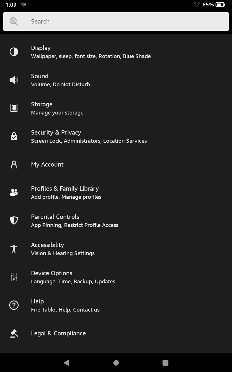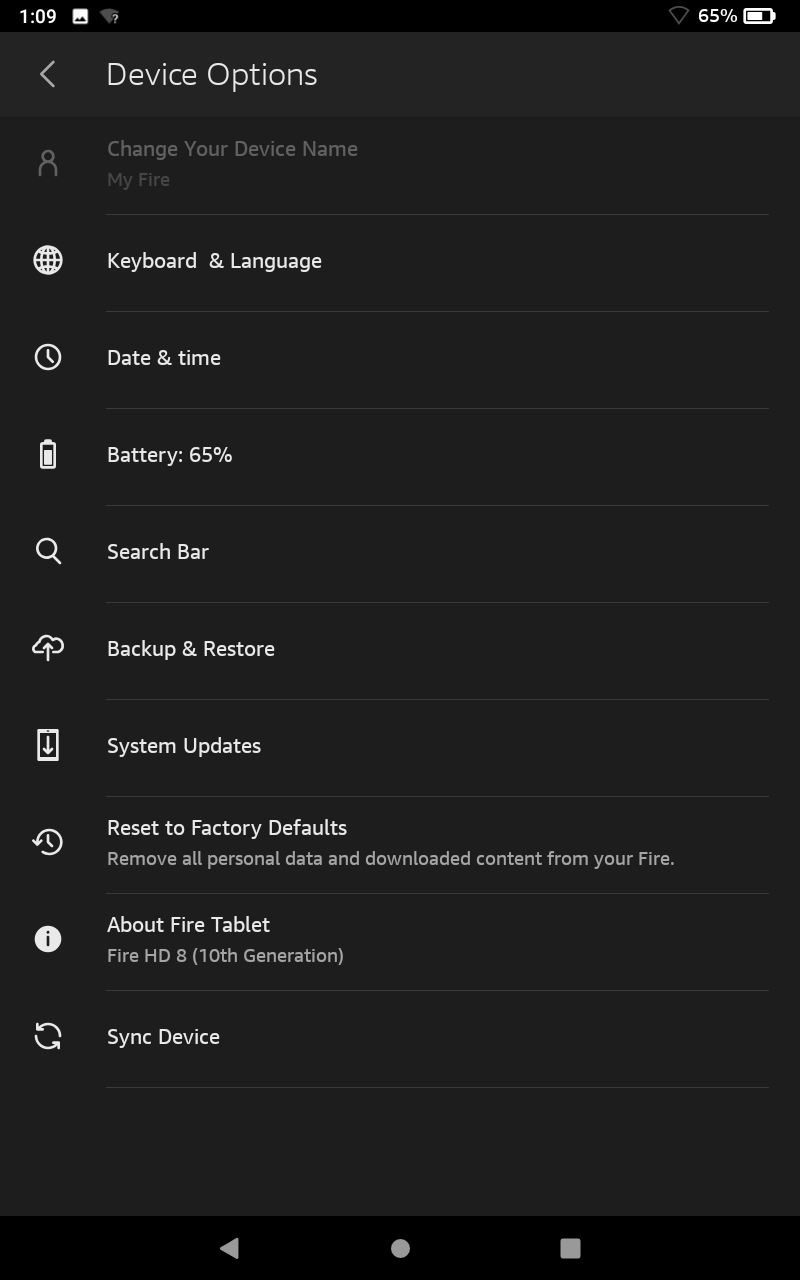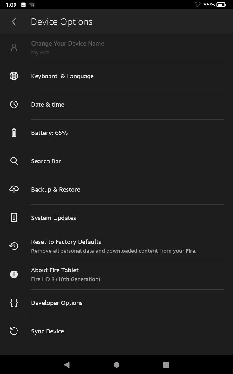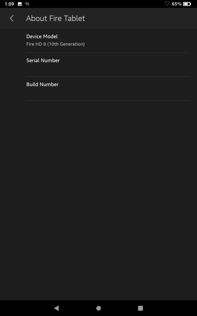 Device Options 메뉴로 들어가서 About Fire Tablet을 누르면