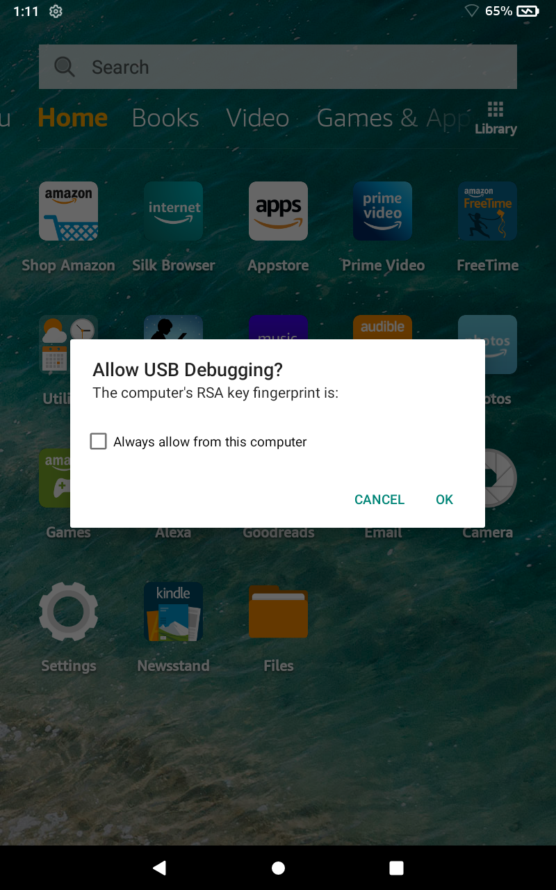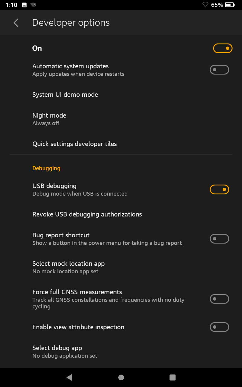 Debugging 탭에서 USB dubugging을 활성화시키면 이제 파이어 HD 8에서의 준비가 끝이 납니다.