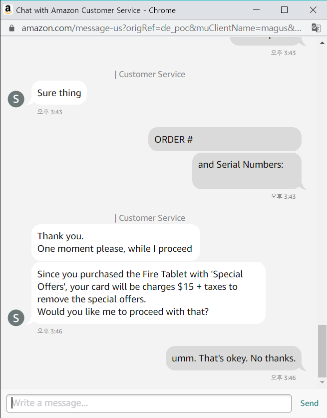 저는 아마존 라이브 채팅을 거쳐서 광고를 지워볼 계획입니다.