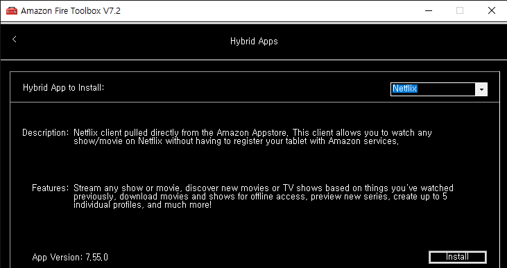 Hybtid Apps 메뉴로 들어가서 Hybrid App to Install에서 넷플릭스를 고르고 오른쪽 아래 인스톨 버튼을 누르면