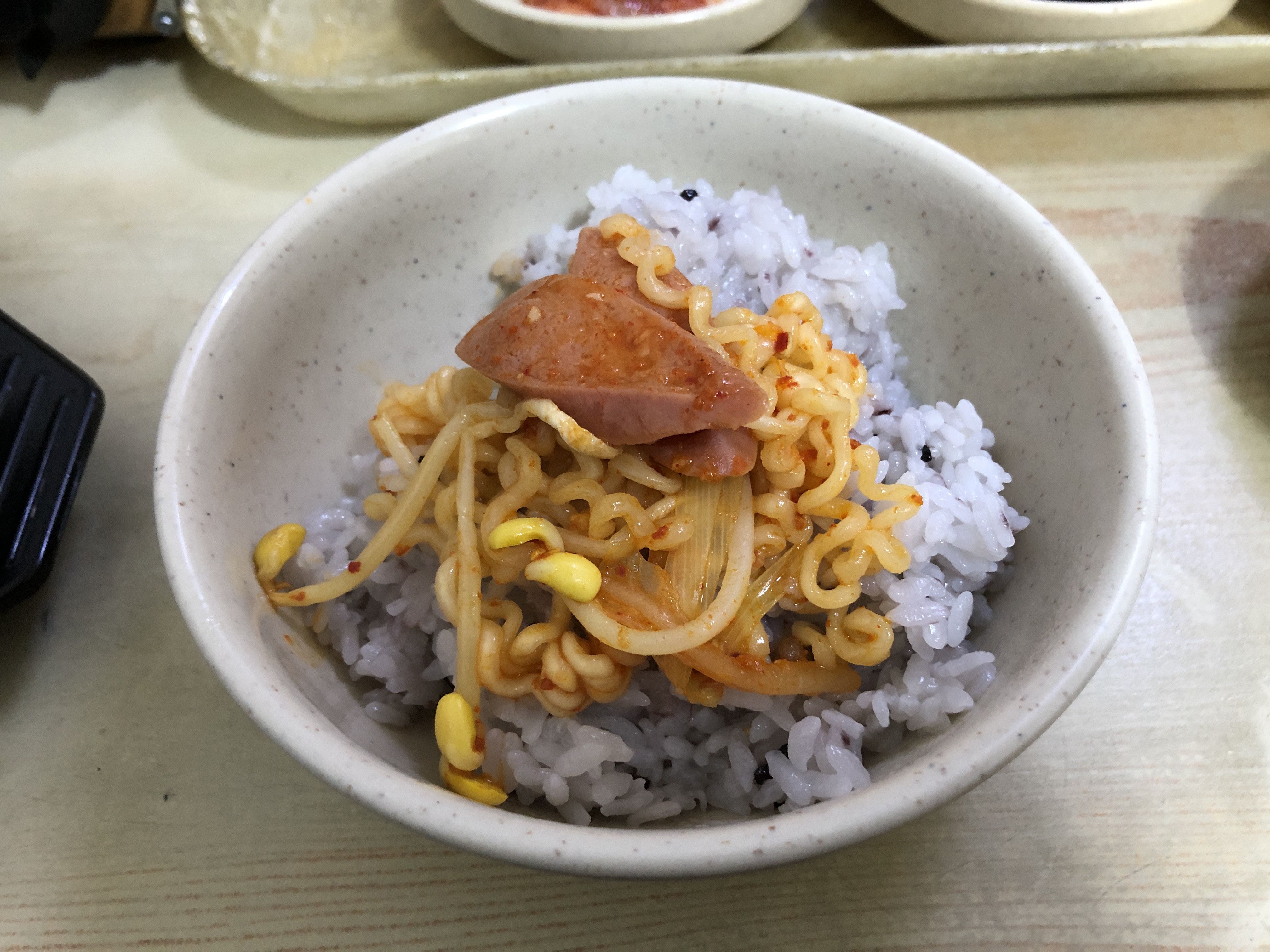 얼핏 봐도 스팸에 소시지, 콩나물과 배추 등 각종 야채에 라면사리까지