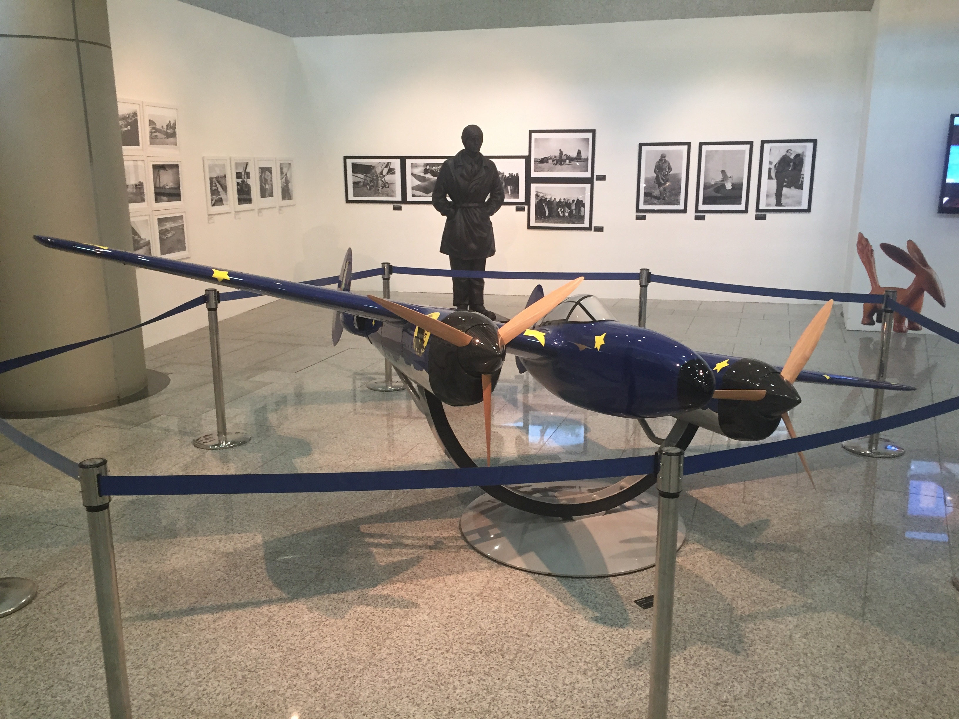 그가 마지막으로 탄 비행기 P-38 라이트닝 모형을 지나