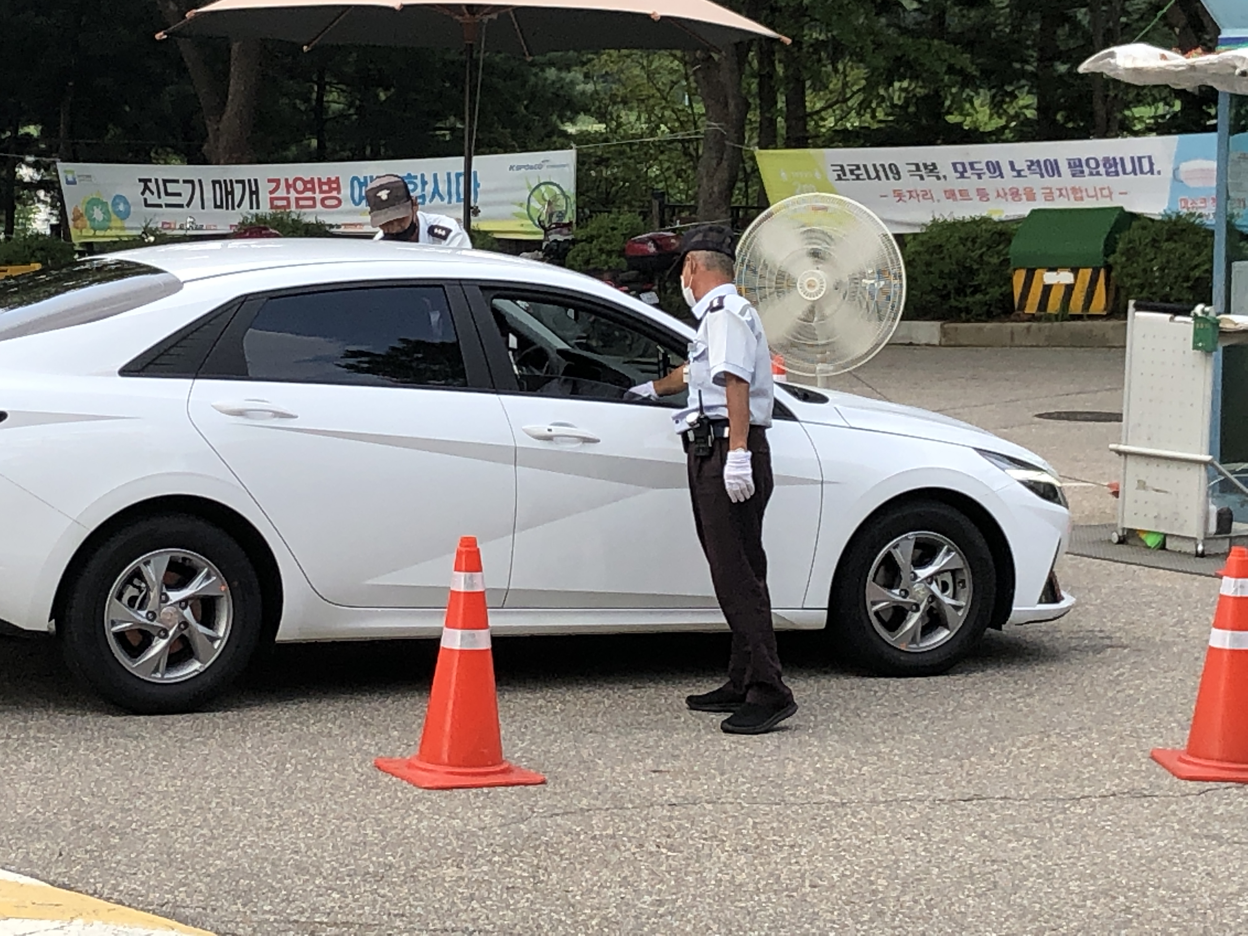 자동차를 타고 들어오는 사람은 물론 인도를 통해 걸어오는 사람도 모두 체온을 재네요.