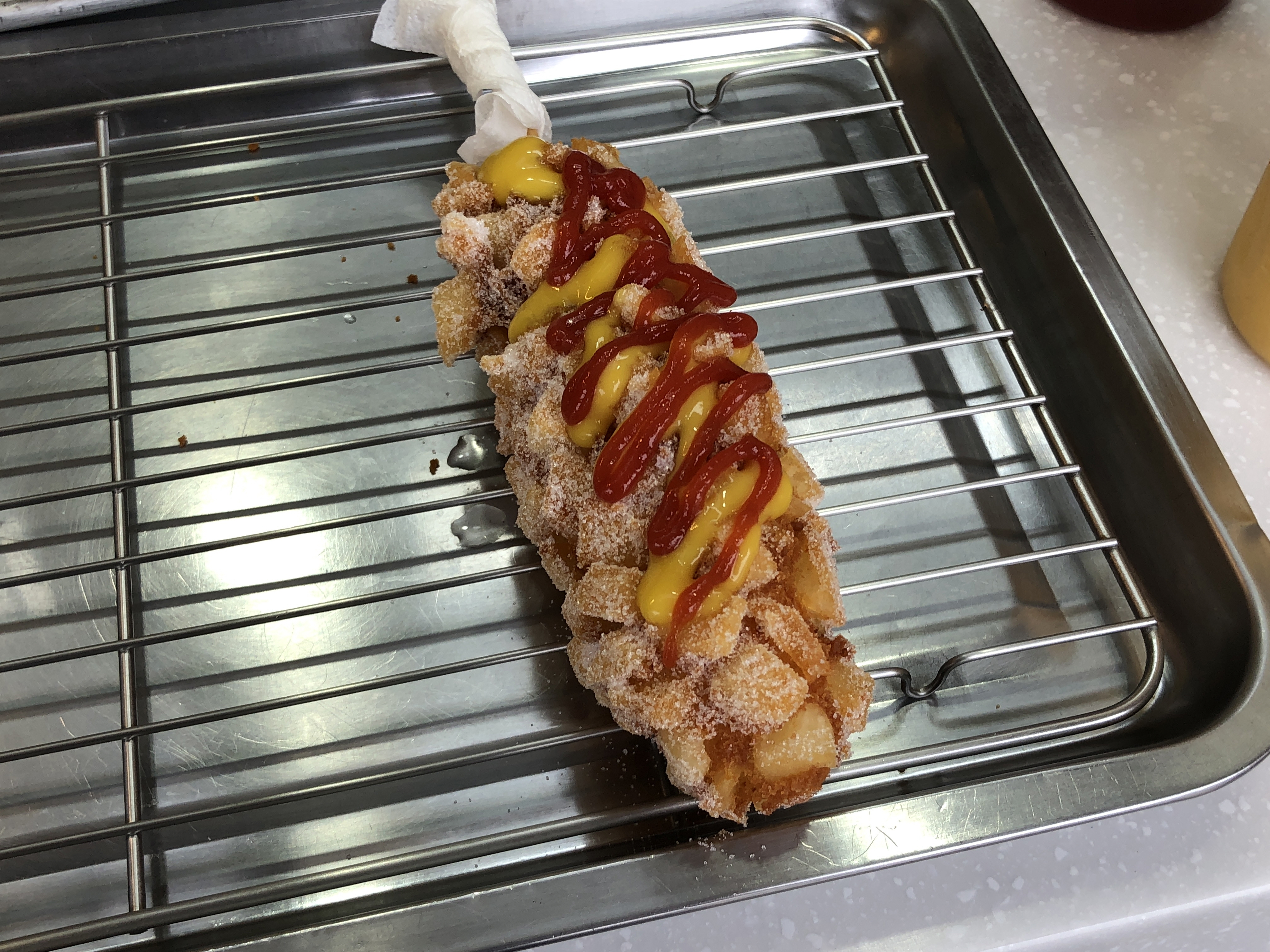 야외에서 감자 핫도그로 말 그대로 배만 채운 뒤