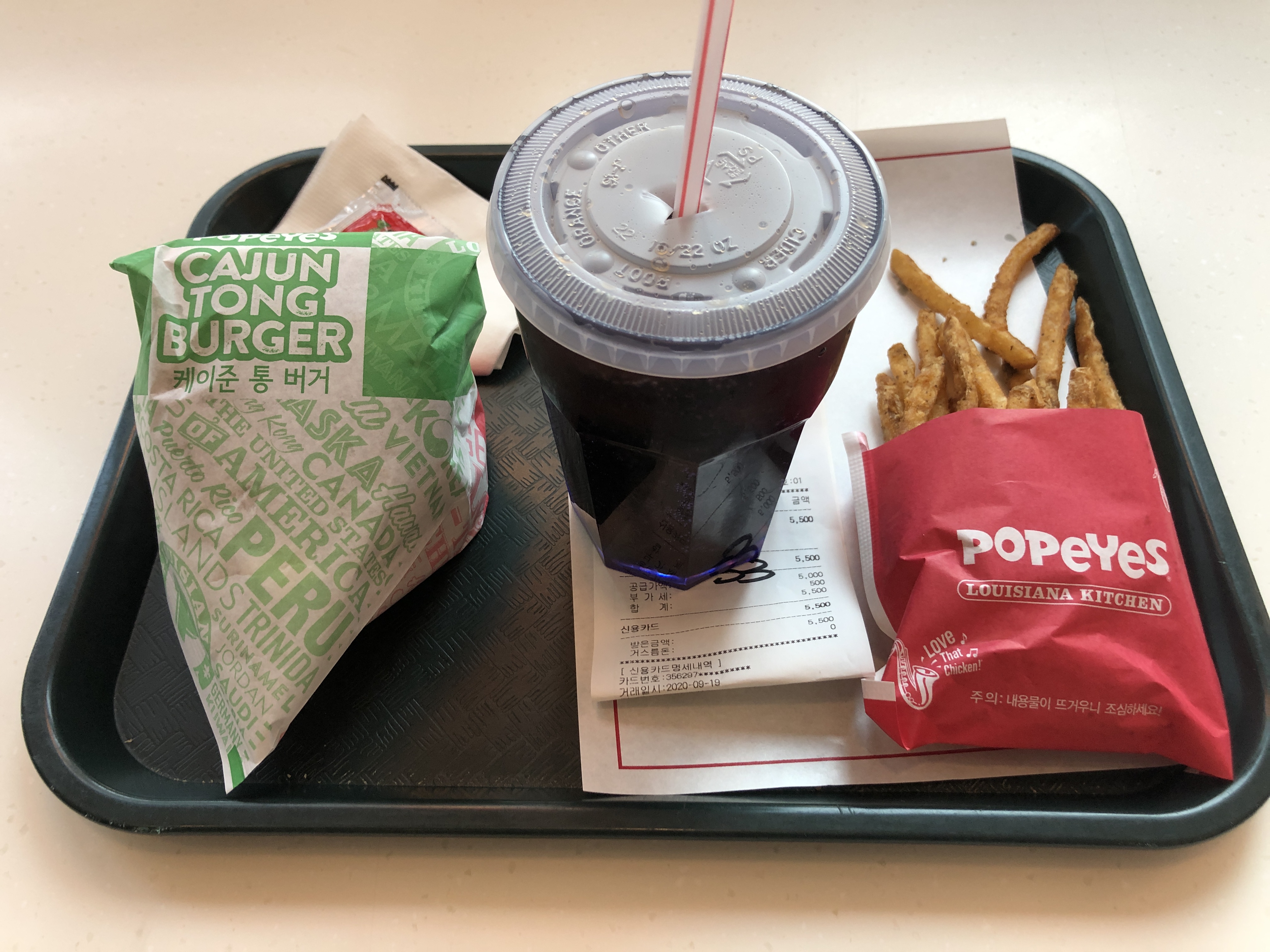 런치 시간대라 가격이 5,500원으로 같길래 괜히 케이준 통 버거를 주문해봤습니다.