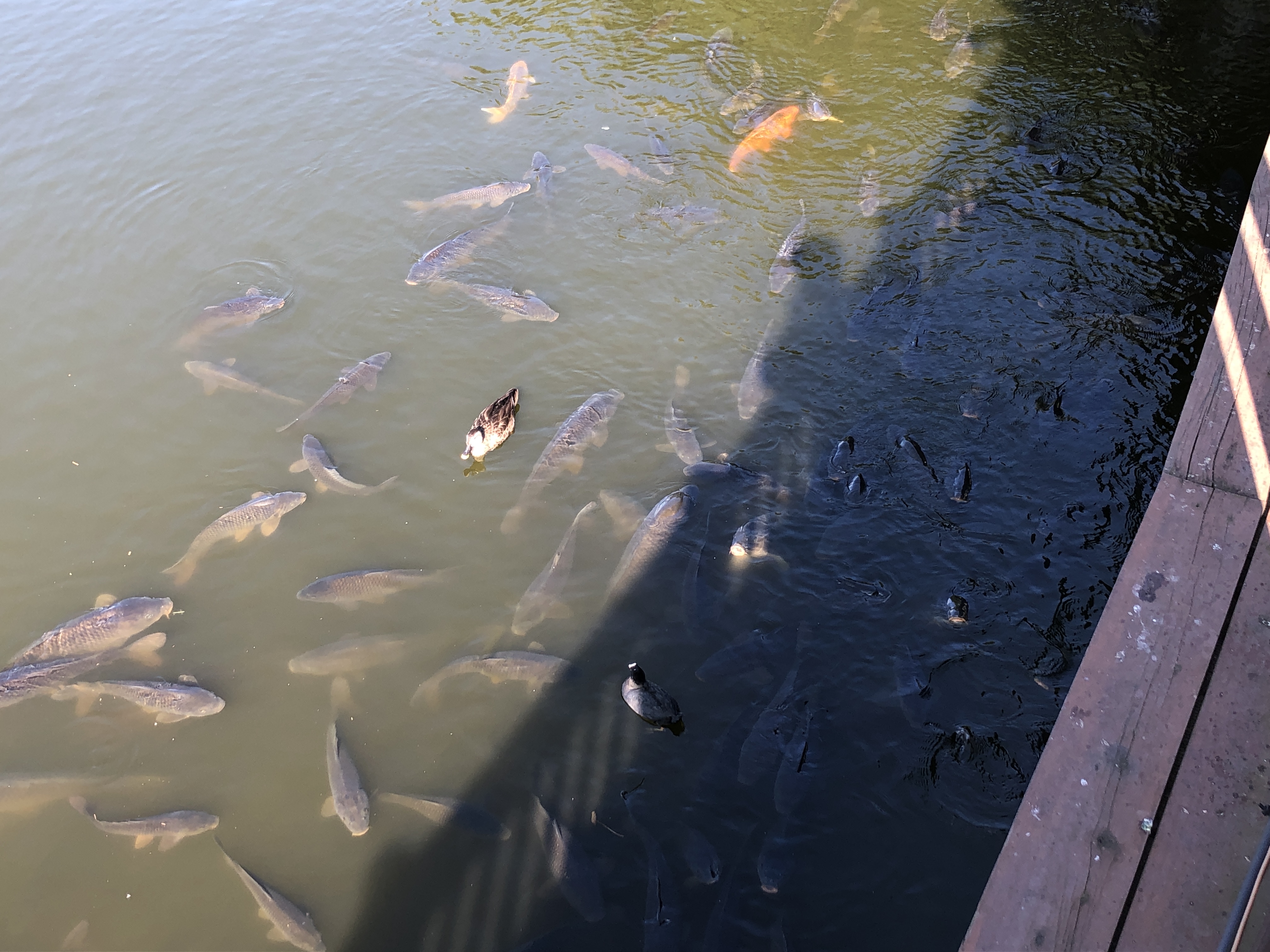 아까보다 더 많은 잉어 떼가 보여