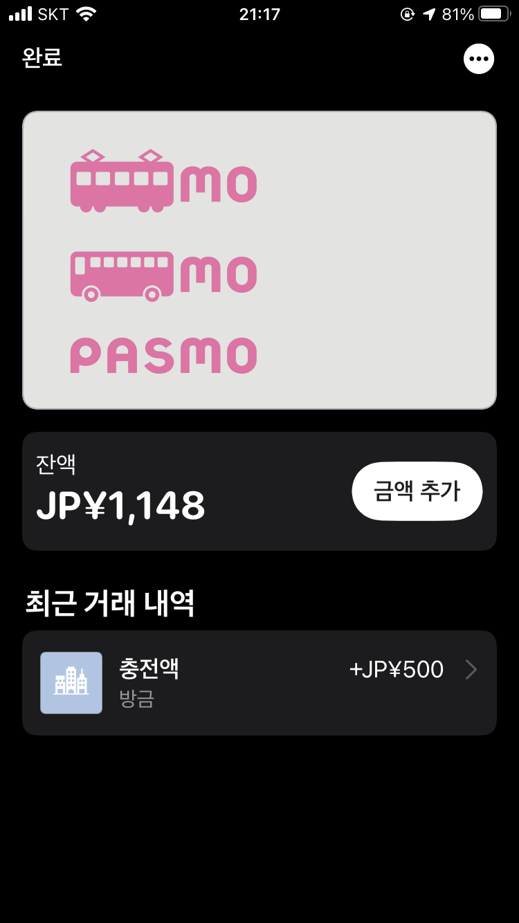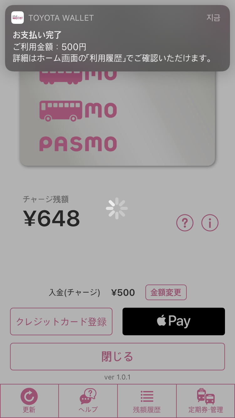 다행히 조금 지나니 결제가 끝나서 파스모 잔액이 늘어났습니다.