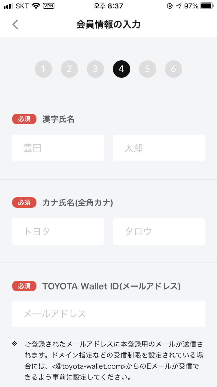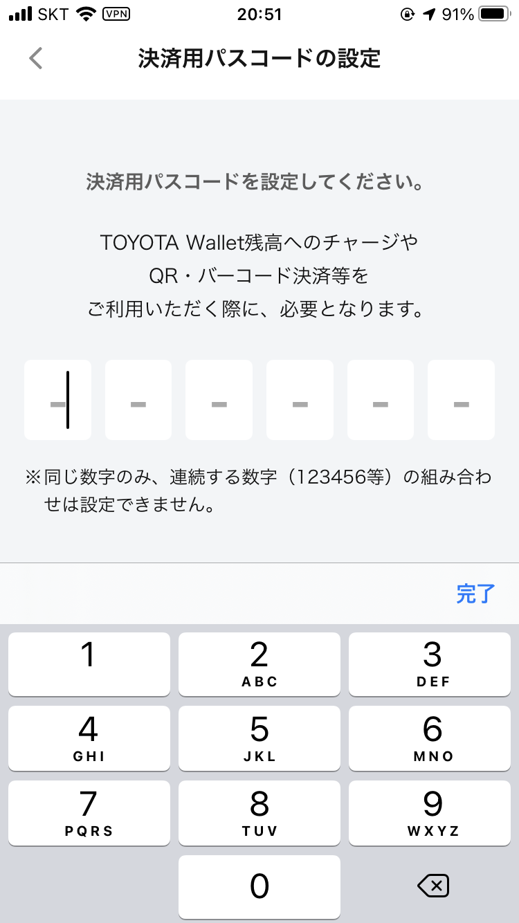 앞으로 토요타 월렛 앱애서 쓸 비밀번호 6자리를 지정한 뒤