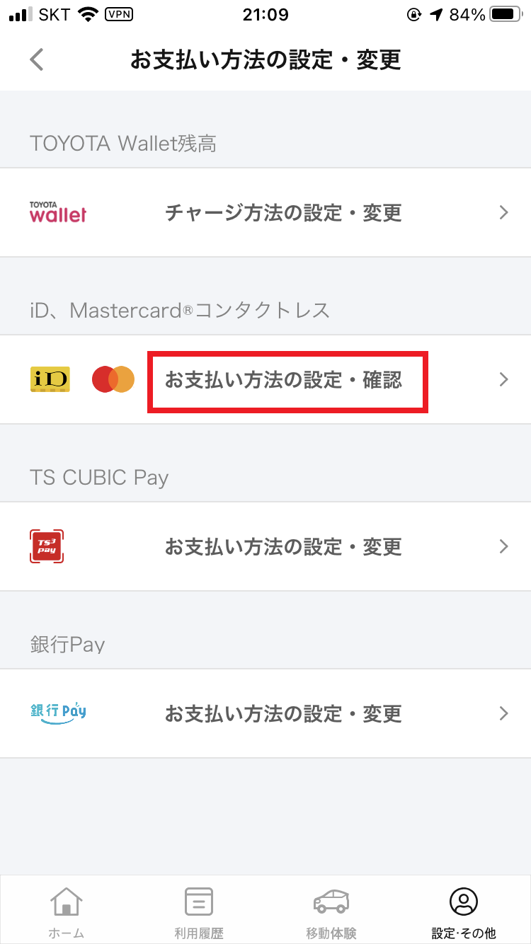 iD/Mastercard 아래 충전방법 설정 버튼을 터치.
